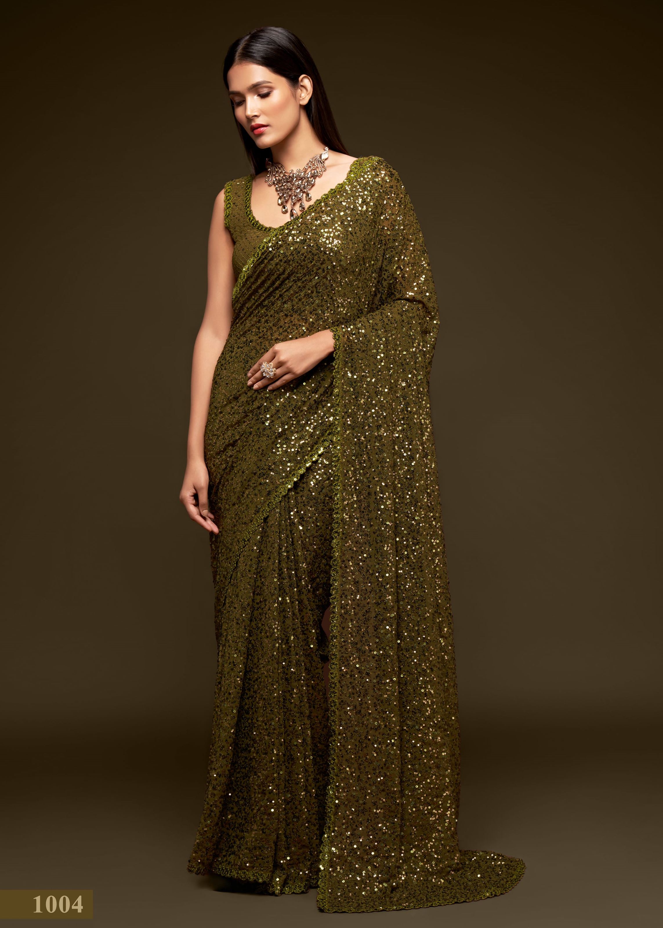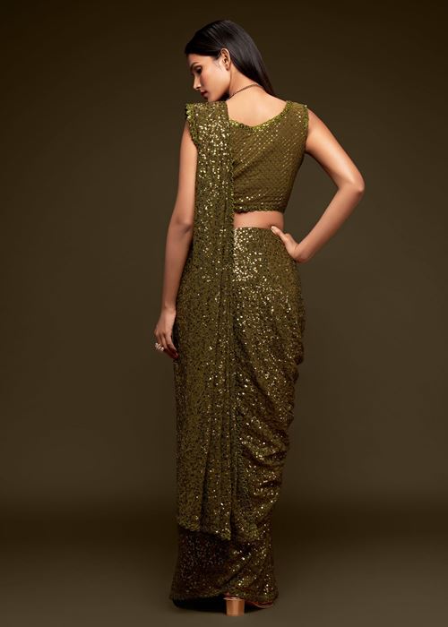 Olive Green Georgette Saree with Thread Embroidery and Sequins Work
