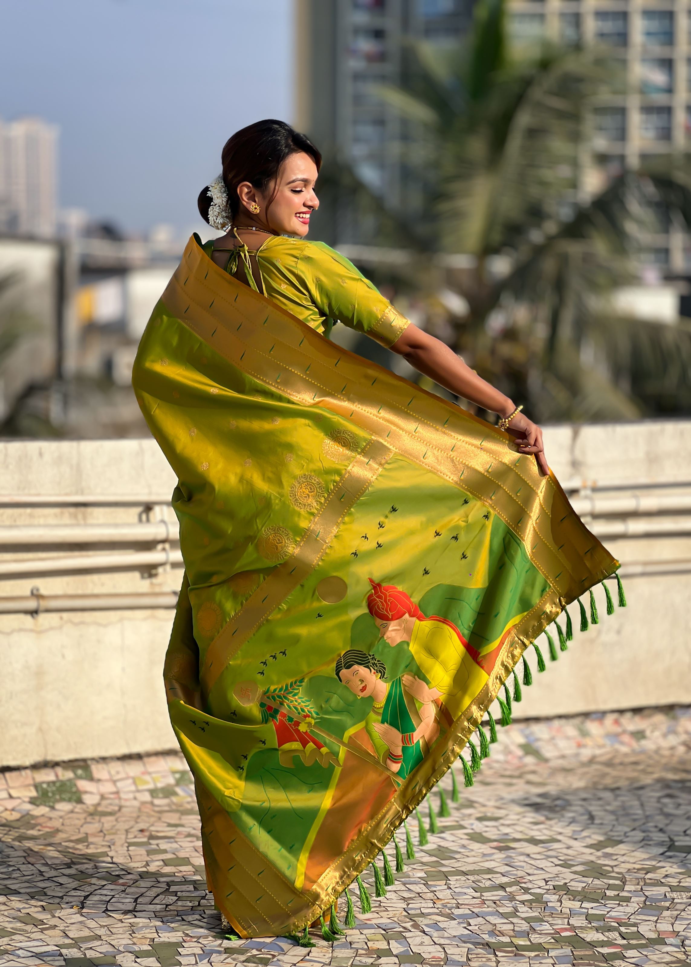 Olive Silk Blend Paithani Saree With Gudi Padwa Print