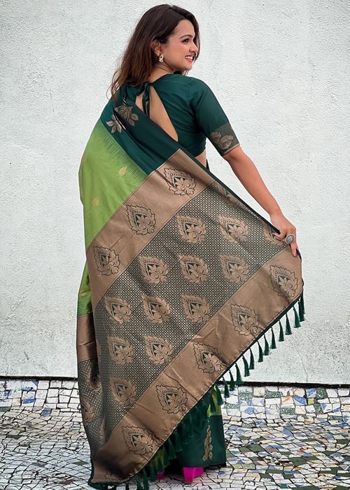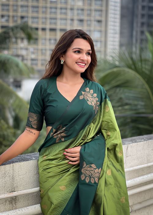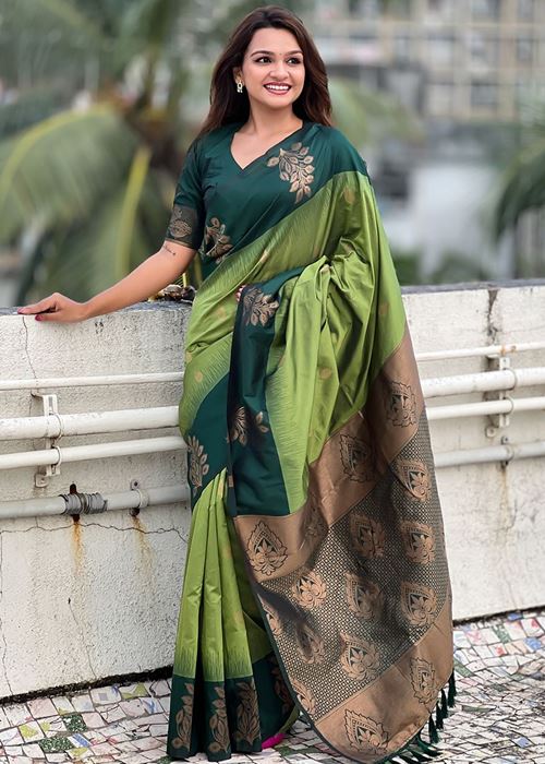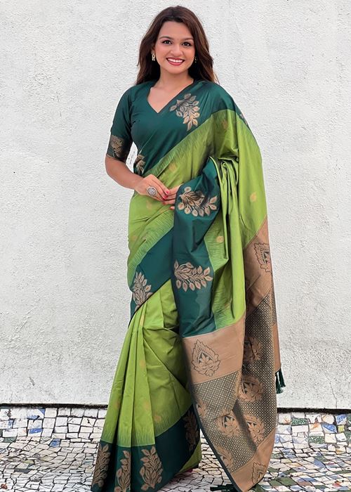 Olive Silk Blend Saree With Floral Border Zari Woven Work