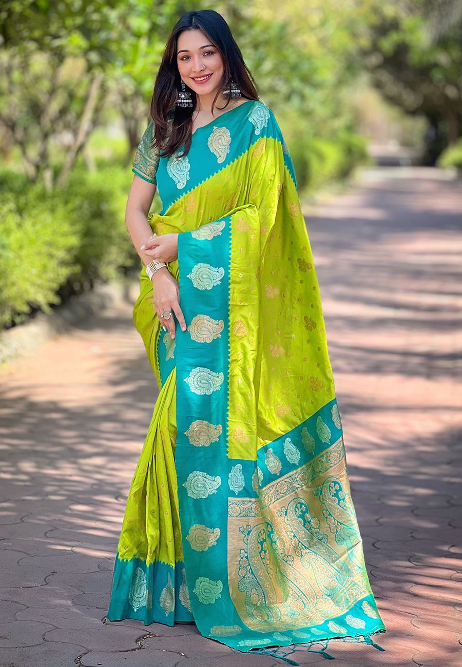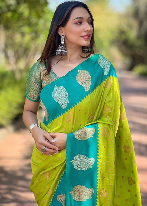 Olive Silk Blend Saree With Floral Border Zari Woven Work