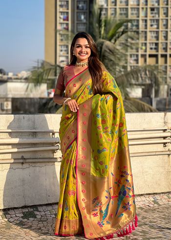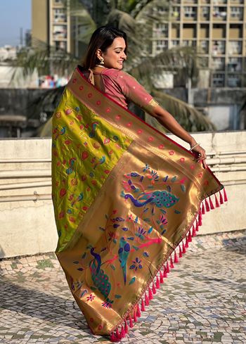 Olive Soft Silk Fabri Woven Paithani Meenakari Designer Ceremonial Saree