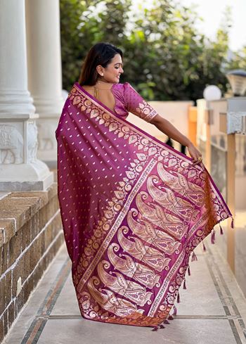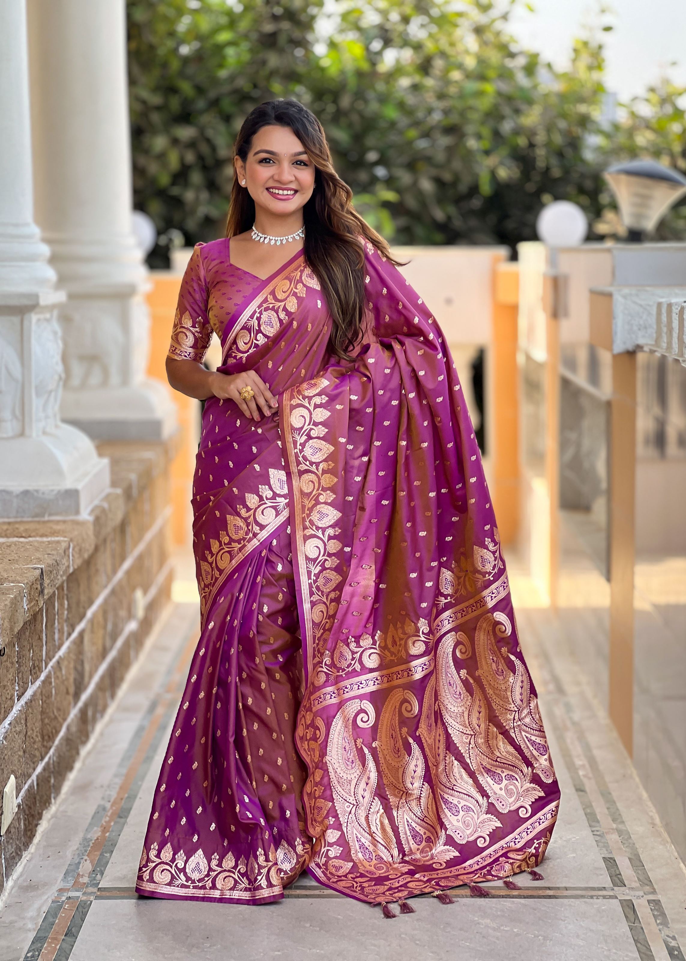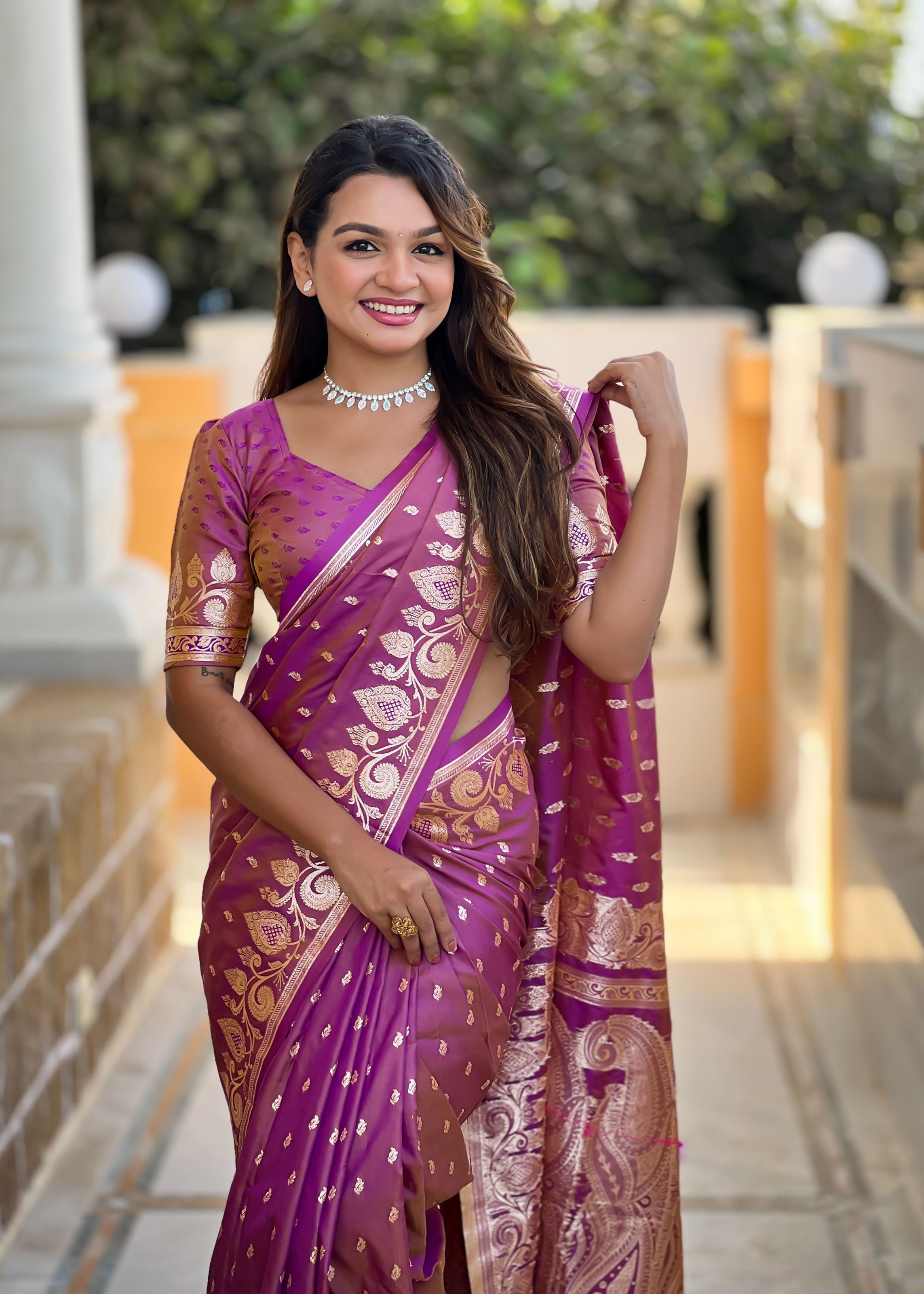 The highlight of this saree is its intricate woven Jacquard work, a symbol of timeless Banarasi craftsmanship. It comes with a matching silk blend blouse in mauve, giving you a coordinated and elegant ensemble. The blouse fabric can be tailored to your preferred style, making this saree versatile for any event.
