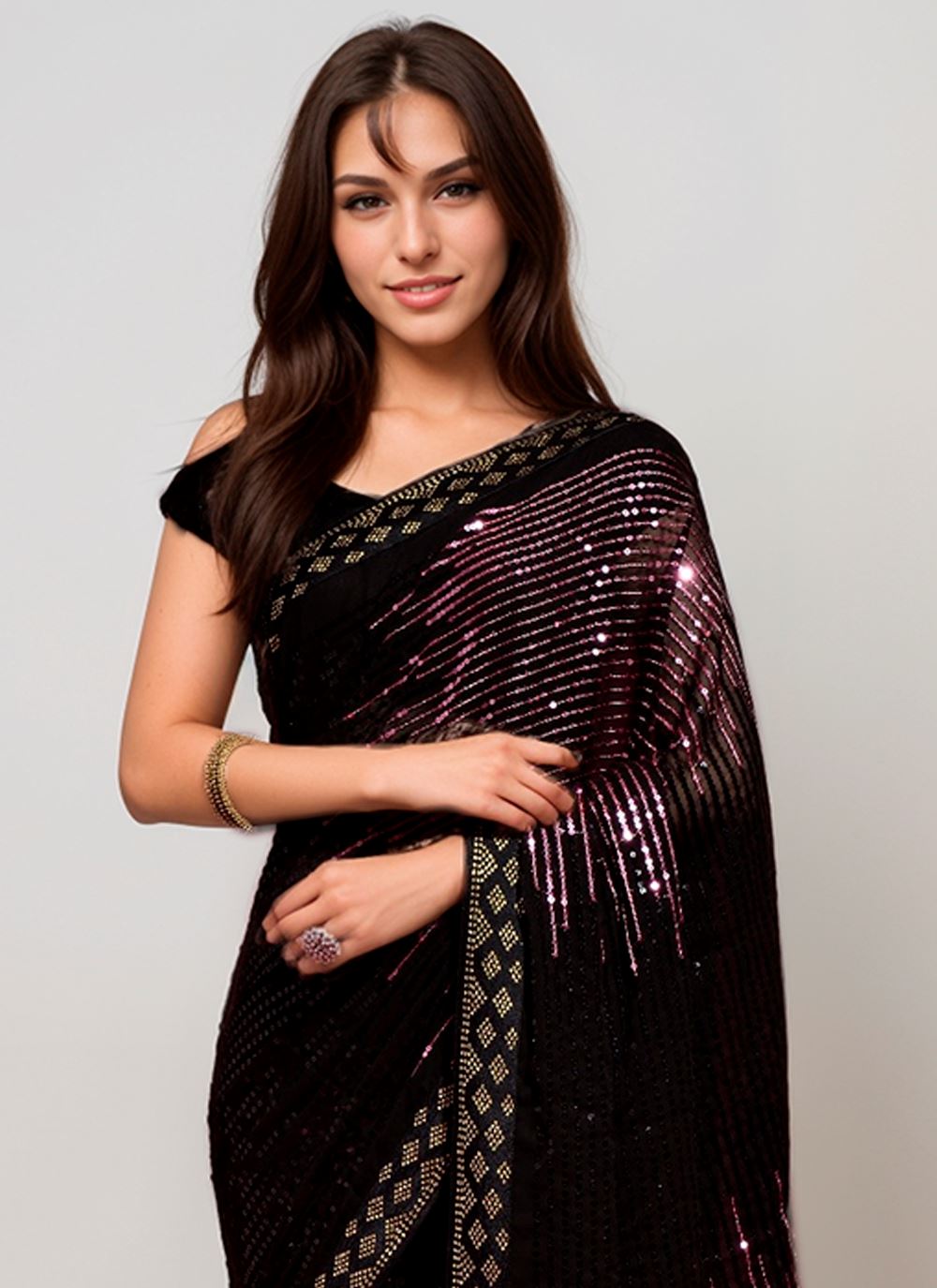 The saree comes paired with a contrasting black blouse piece made of high-quality art silk fabric, enhancing the overall bold and stylish look. This elegant color combination of mauve and black creates a striking visual appeal that never goes out of style.Accessorize this saree with sparkling jewelry, a chic clutch, and elegant heels to complete your Bollywood-inspired ensemble. Whether it’s a wedding reception, festive celebration, or cultural gathering, this saree will make you the center of attention.