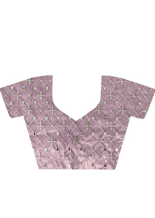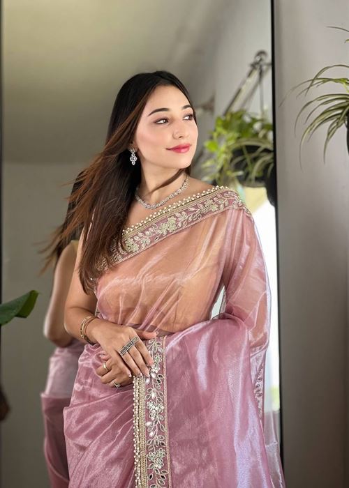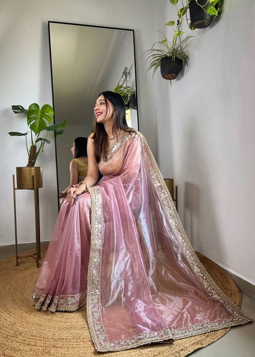 Onion Colour Silver Tissue Silk Embroidery And Mirror Work Saree