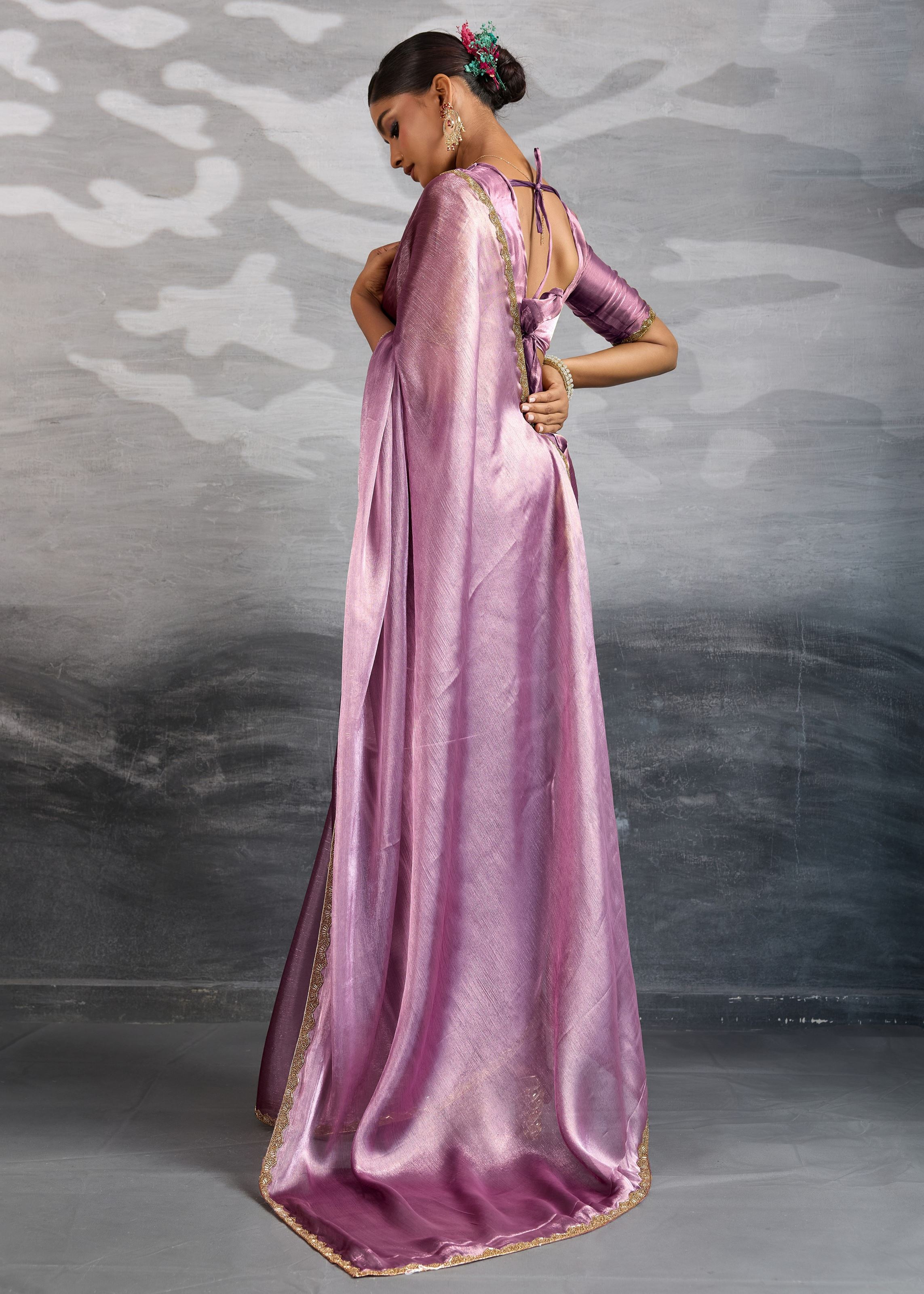 Gracefully subtle and endlessly elegant, this Onion Pink Burberry Chiffon Saree is an ode to soft glam and timeless craftsmanship. Designed with delicate bead embellishments and shimmering Cutdana lace, it blends minimalism with festive sparkle. The Burberry Chiffon fabric drapes like a dream—lightweight, breathable, and perfect for day-to-night occasions.