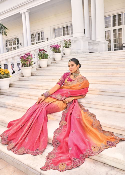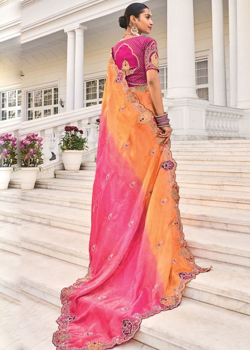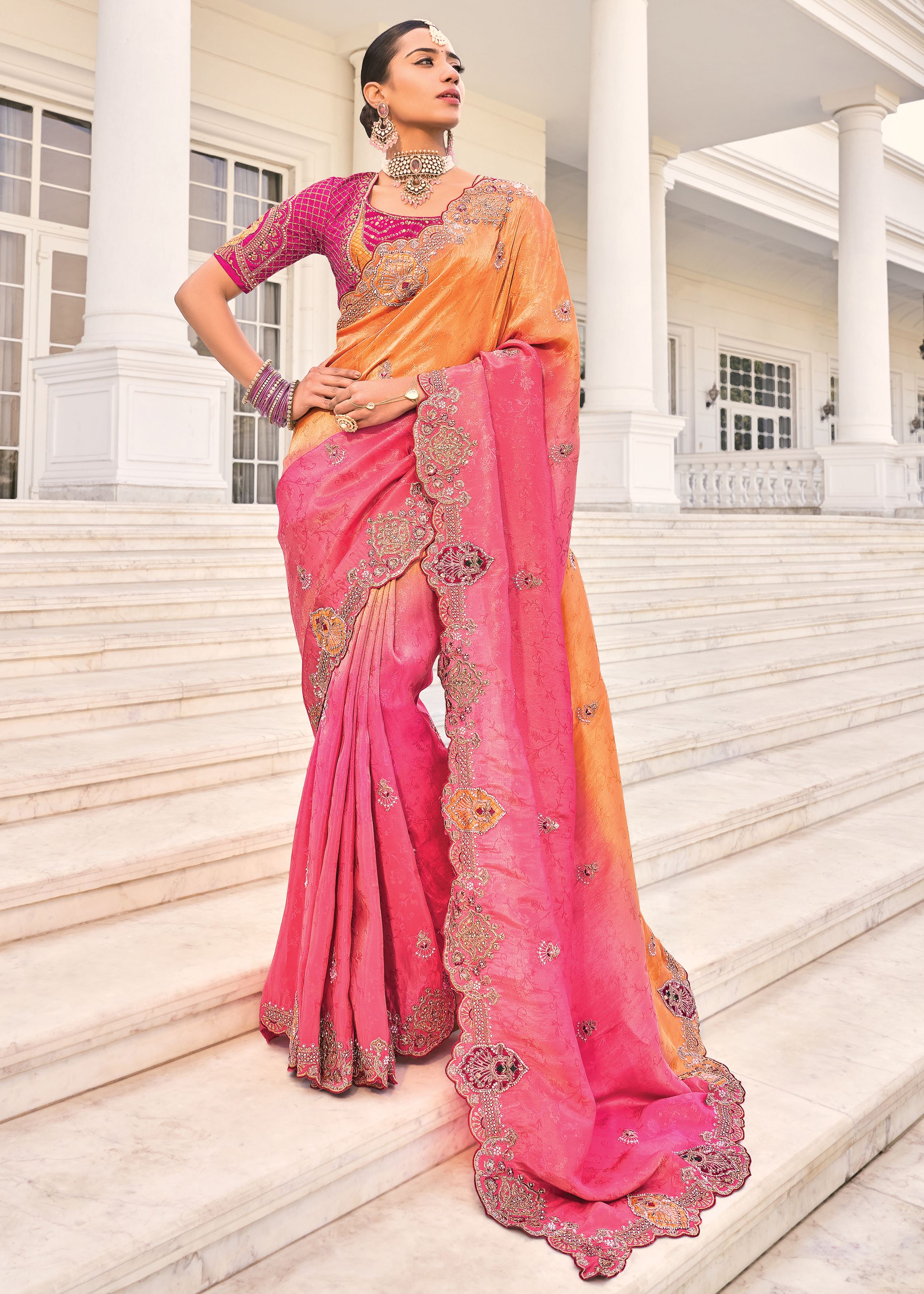 Orange & Rani Natural Crepe Jacquard Saree With Embroidery Work