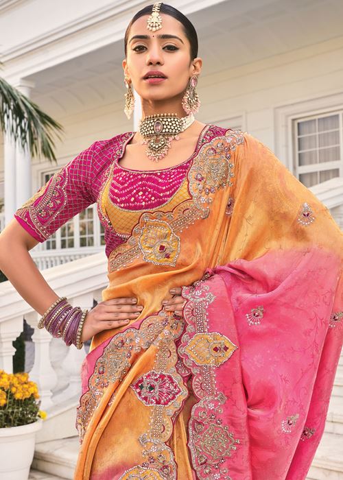 Orange & Rani Natural Crepe Jacquard Saree With Jacquard With Zari, Cut-Dana With Moti Heavy Work
