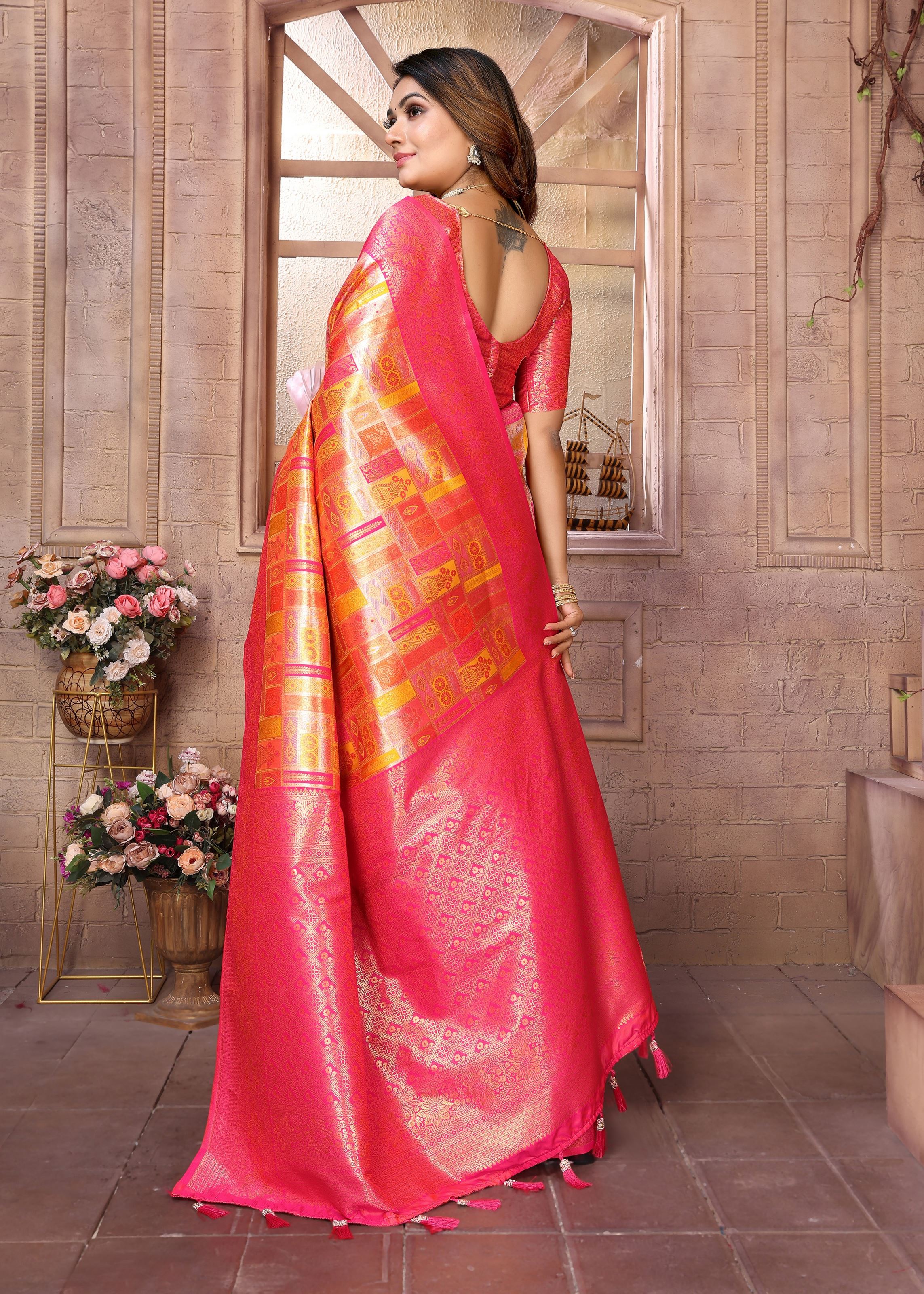 Orange Banarasi Chaturi Silk Ethnic Saree With Chaturi Woven Designer Work