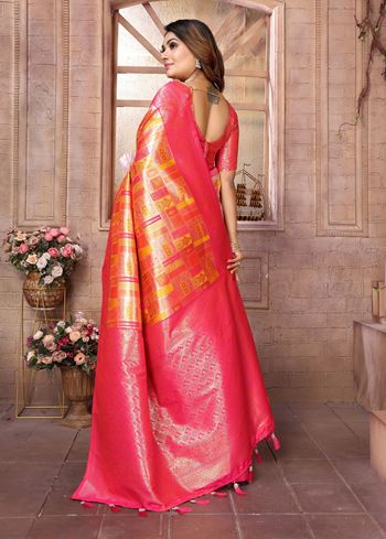 Paired with a contrasting pink silk blend blouse, the saree achieves a perfect balance of vibrancy and sophistication. The bold yet graceful color combination ensures this ensemble stands out beautifully, making it versatile for both grand functions and intimate celebrations. Whether accessorized with heavy traditional jewelry or styled with minimalist accents, this saree adapts effortlessly to every mood and moment.