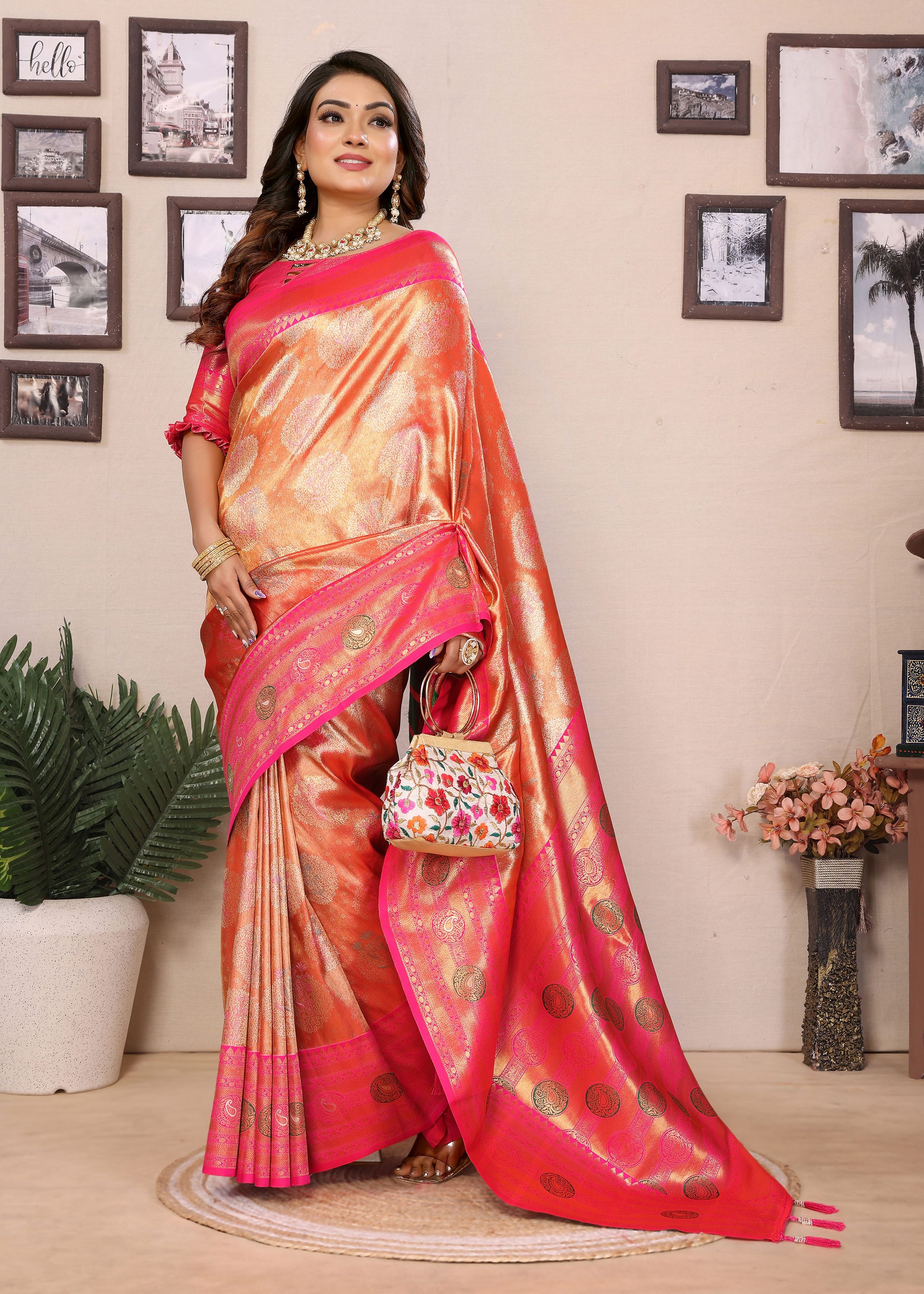 Orange Banarasi Tissue Silk Saree With Woven Paithani Designer