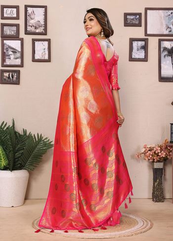 Paired with a matching orange silk blend blouse, this saree forms a cohesive and striking ensemble ideal for weddings, festive celebrations, and cultural events. The bright orange shade exudes warmth, energy, and vibrancy, making it a statement piece for any occasion. Its classic design paired with modern elegance ensures versatility, perfect for both traditional and festive gatherings.
