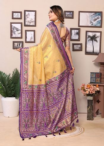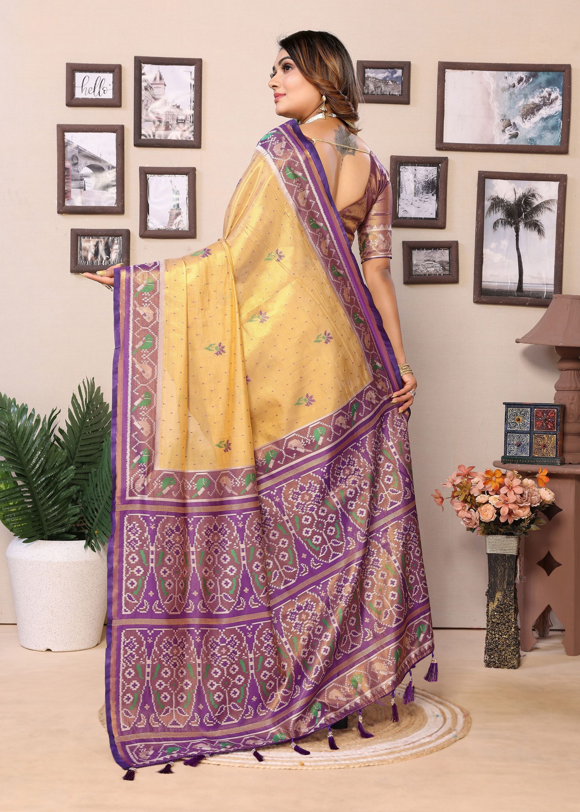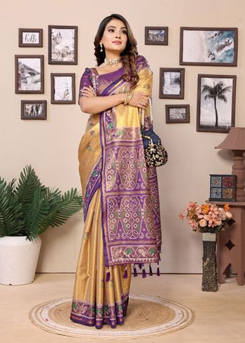 Infuse vibrancy into your festive wardrobe with this Orange Banarasi Tissue Silk Woven Patola Designer Saree, exclusively from Aethnofit Fashions. Crafted in premium tissue silk, this saree features exquisite Banarasi weaving with traditional Patola-inspired designs, combining heritage craftsmanship with modern elegance. The bright orange shade paired with a contrasting purple tissue silk blouse creates a striking and graceful ensemble, perfect for weddings, festive occasions, and cultural celebrations.