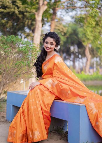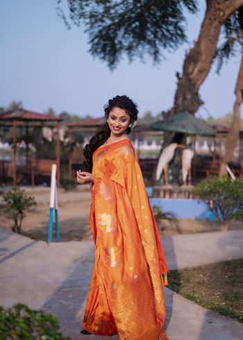 The saree comes with a matching silk blend blouse, creating a harmonious and polished look. Its bright orange hue radiates warmth and charm, perfect for those who want to stand out gracefully at any gathering. Designed for both modern and traditional sensibilities, this saree effortlessly complements jewelry and accessories for a complete festive ensemble.