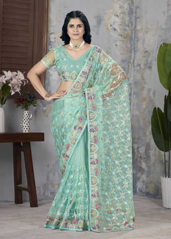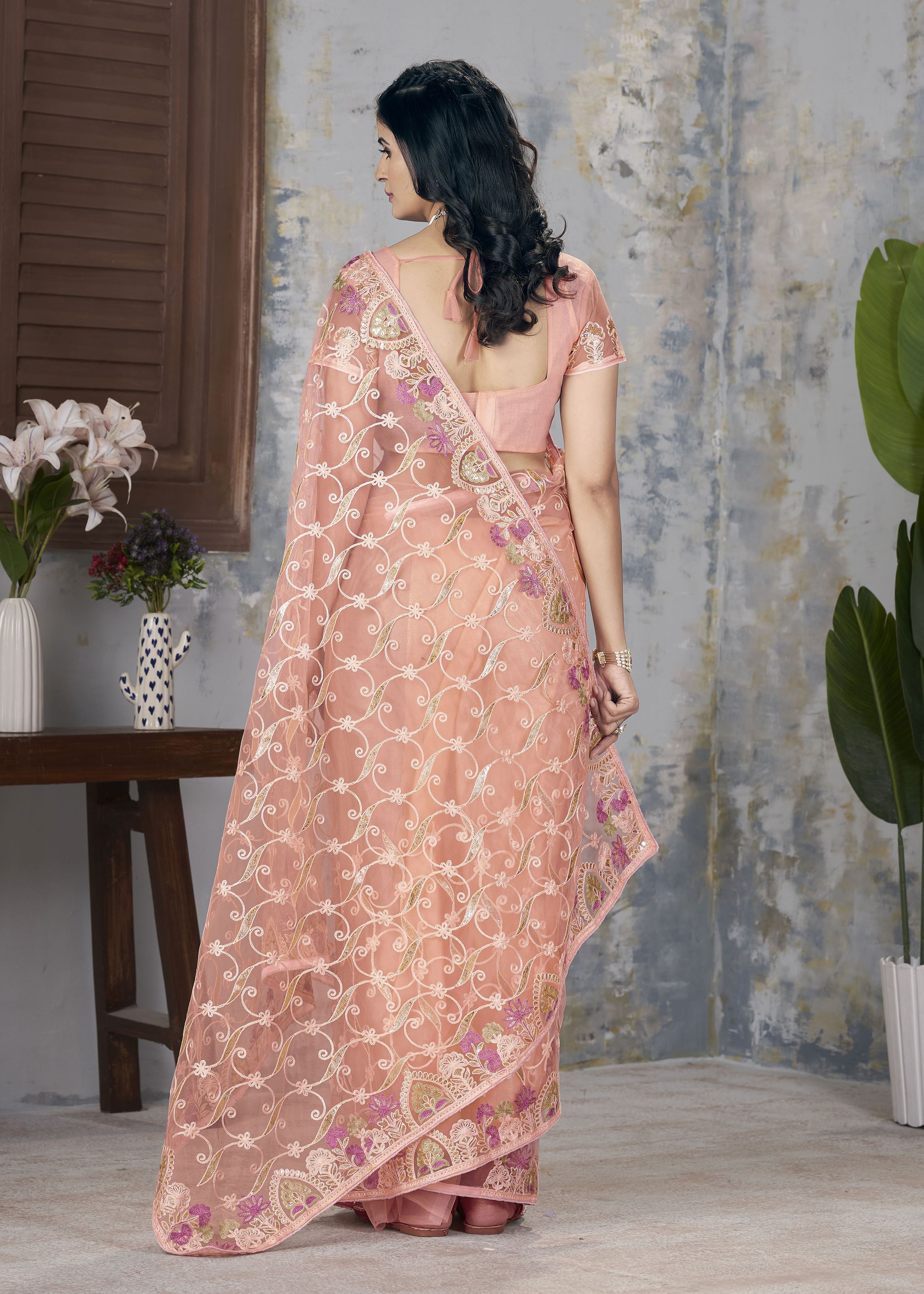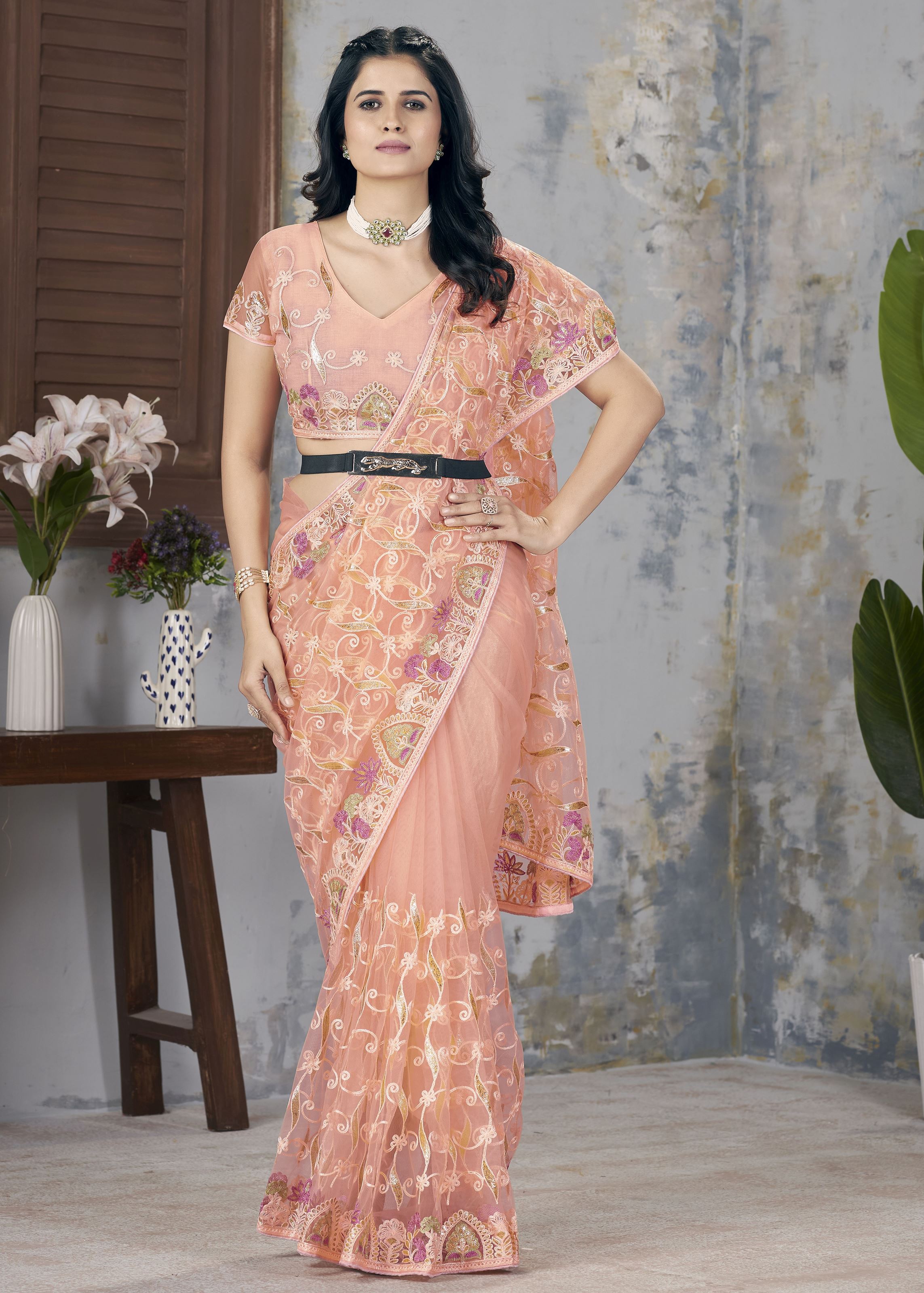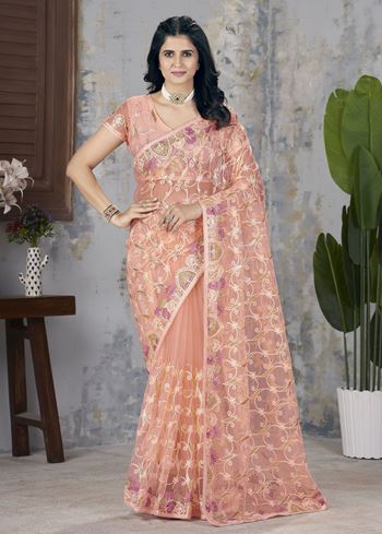 Paired with a matching orange net blouse, the ensemble creates a cohesive and graceful look. The lightweight net fabric ensures effortless draping and comfort, while the intricate embroidery showcases expert craftsmanship and contemporary aesthetics. This saree is designed to make you stand out at parties, receptions, or special gatherings, offering both elegance and charm.