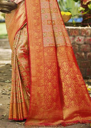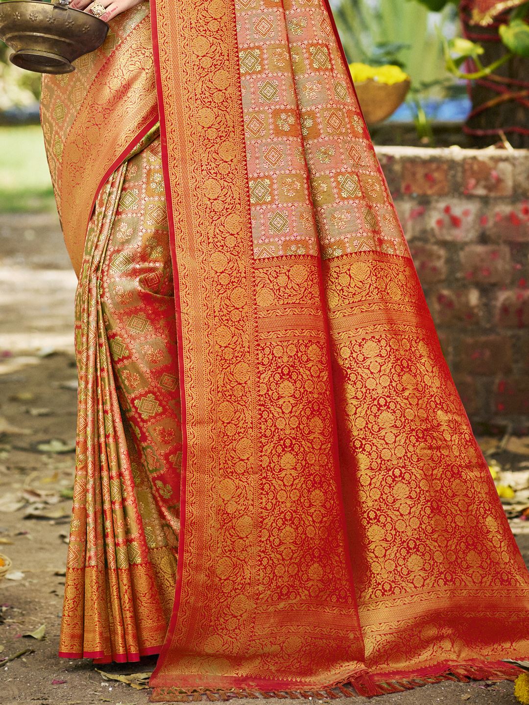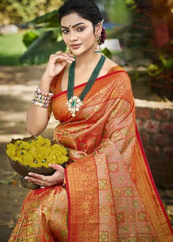 The matching orange Dharmavaram blouse completes the ensemble with flawless harmony. The saree’s texture offers a luxurious fall and firm structure, while still feeling light and breathable on the skin. Whether accessorized with antique gold jewelry or left minimal for everyday wear, this saree adapts effortlessly to your style.