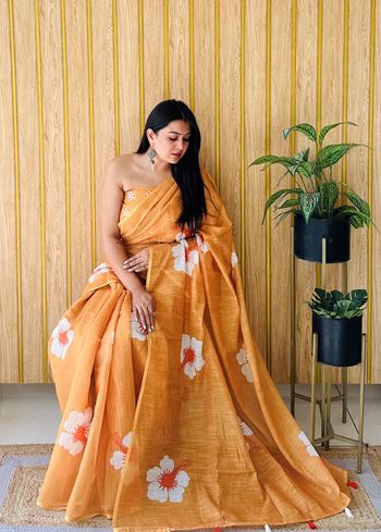 The lively orange hue instantly uplifts your look, making it a vibrant choice for both casual and semi-formal occasions. Adorned with delicate floral printed patterns, it brings a girlie and youthful vibe, perfect for brunch dates, festive gatherings, office events, or even casual outings. The natural linen texture gives the saree an effortlessly graceful appeal, combining tradition with a modern, minimalistic charm.