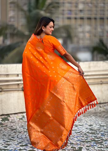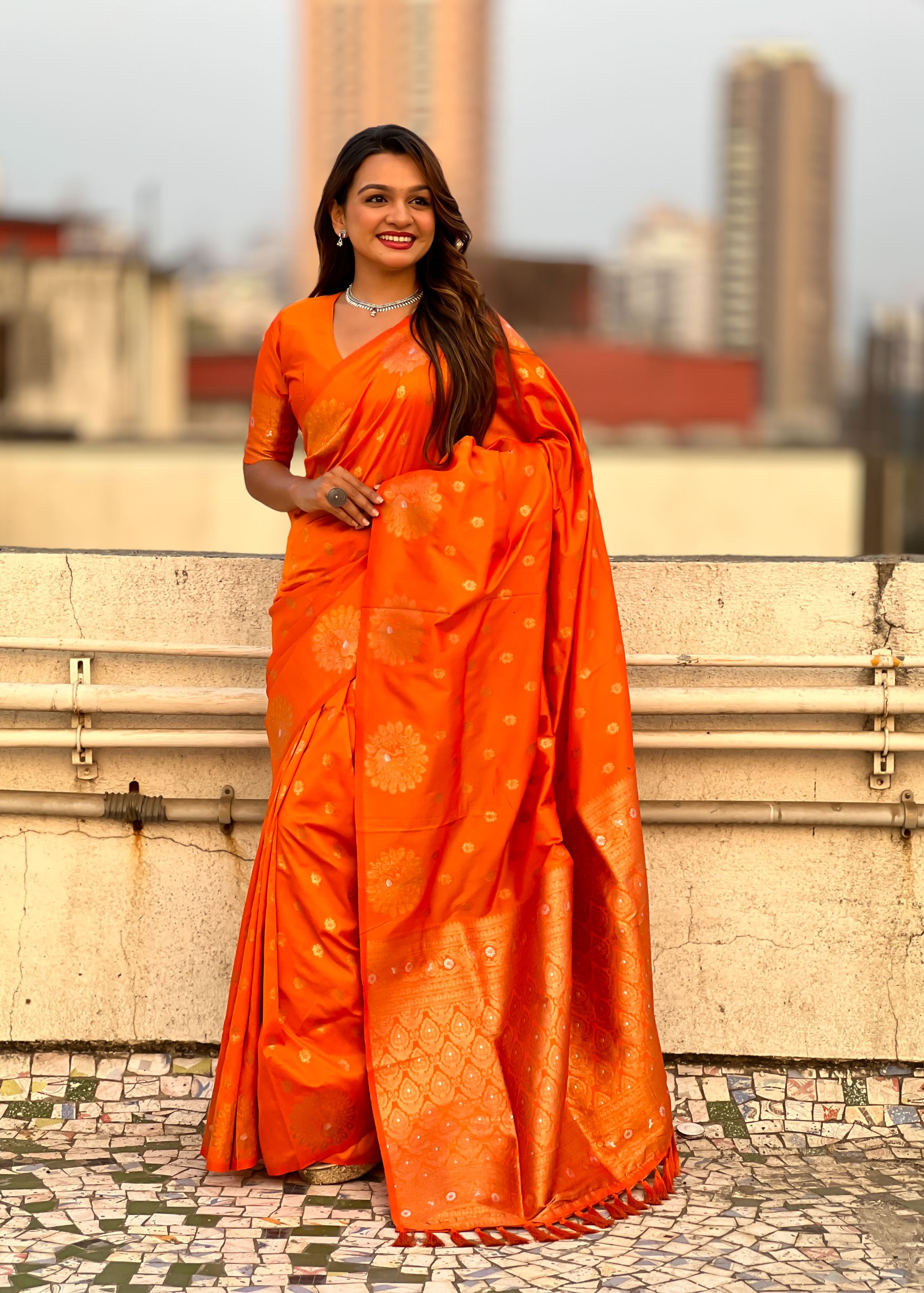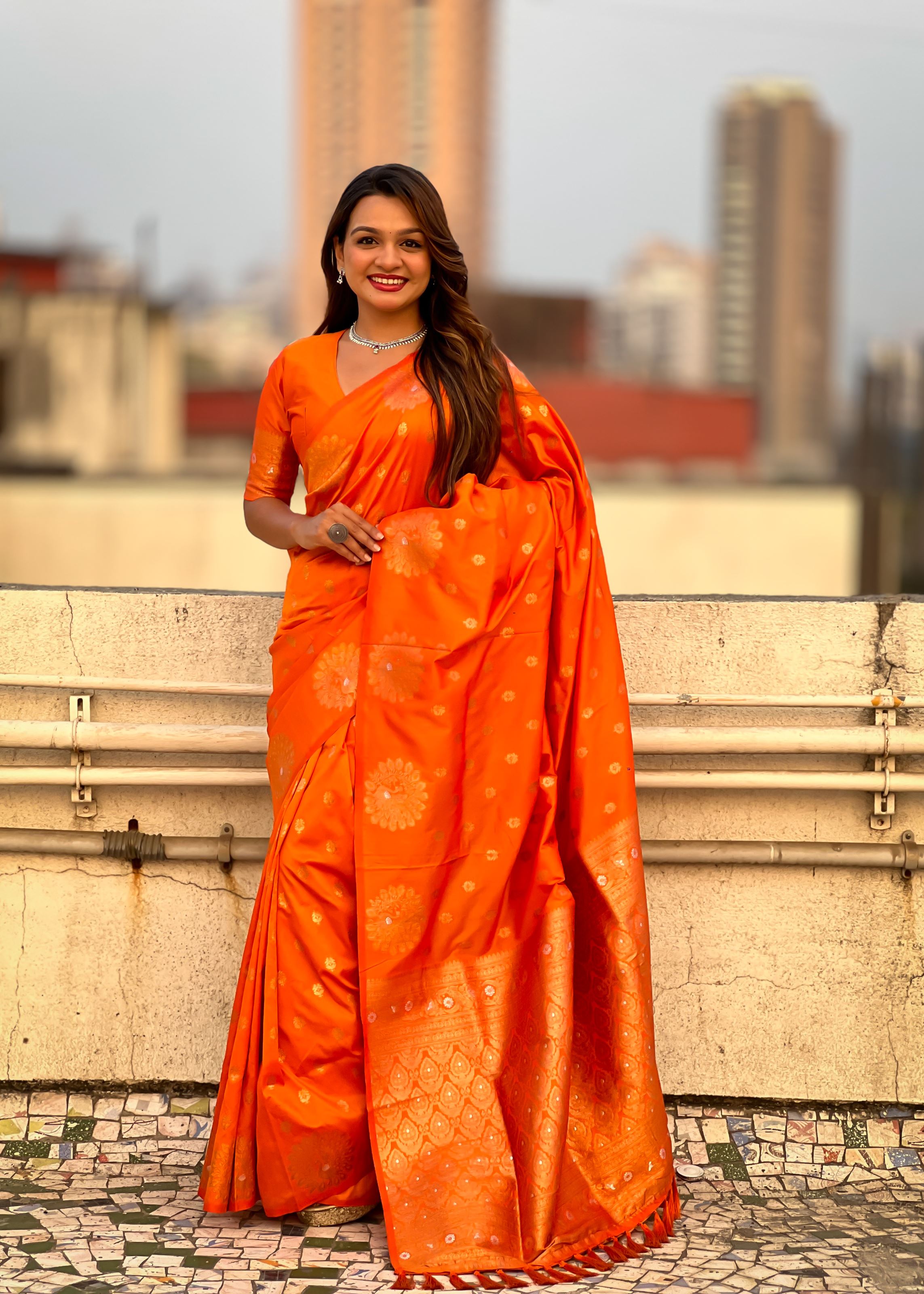 This designer saree is ideal for weddings, festive gatherings, and special occasions, allowing you to make a striking impression. The matching silk blend blouse enhances the ensemble, completing the look with elegance and ease. The vibrant orange hue exudes warmth and charm, making it a standout piece for any celebration.