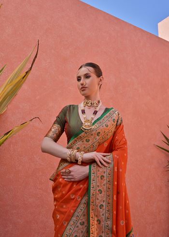Radiate festive charm and cultural richness with this vibrant Orange Paithani Silk Saree, a masterpiece that exudes both grace and tradition. Crafted in premium Paithani silk, this saree is adorned with shimmering zari butti weaves across the body, lending it an ornate yet refined appeal ideal for celebratory occasions.