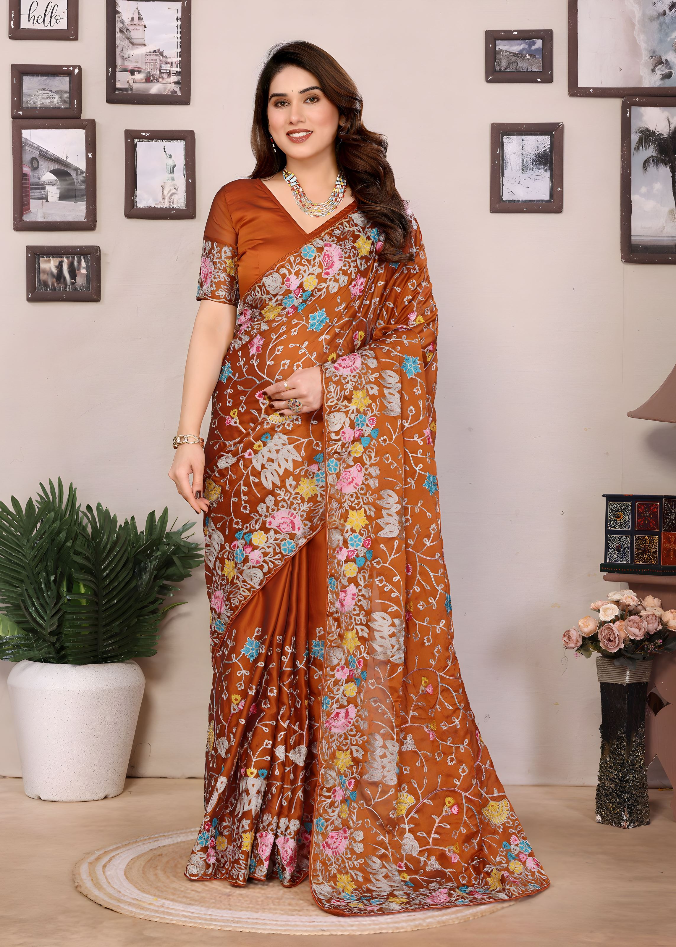 Orange Rangoli Silk Saree with Embroidery with piping border Work