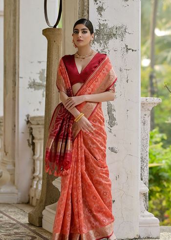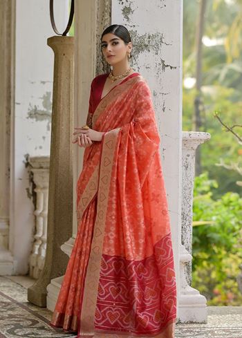 Orange Raw Silk Saree with Ikkat Design and Contrast Pallu