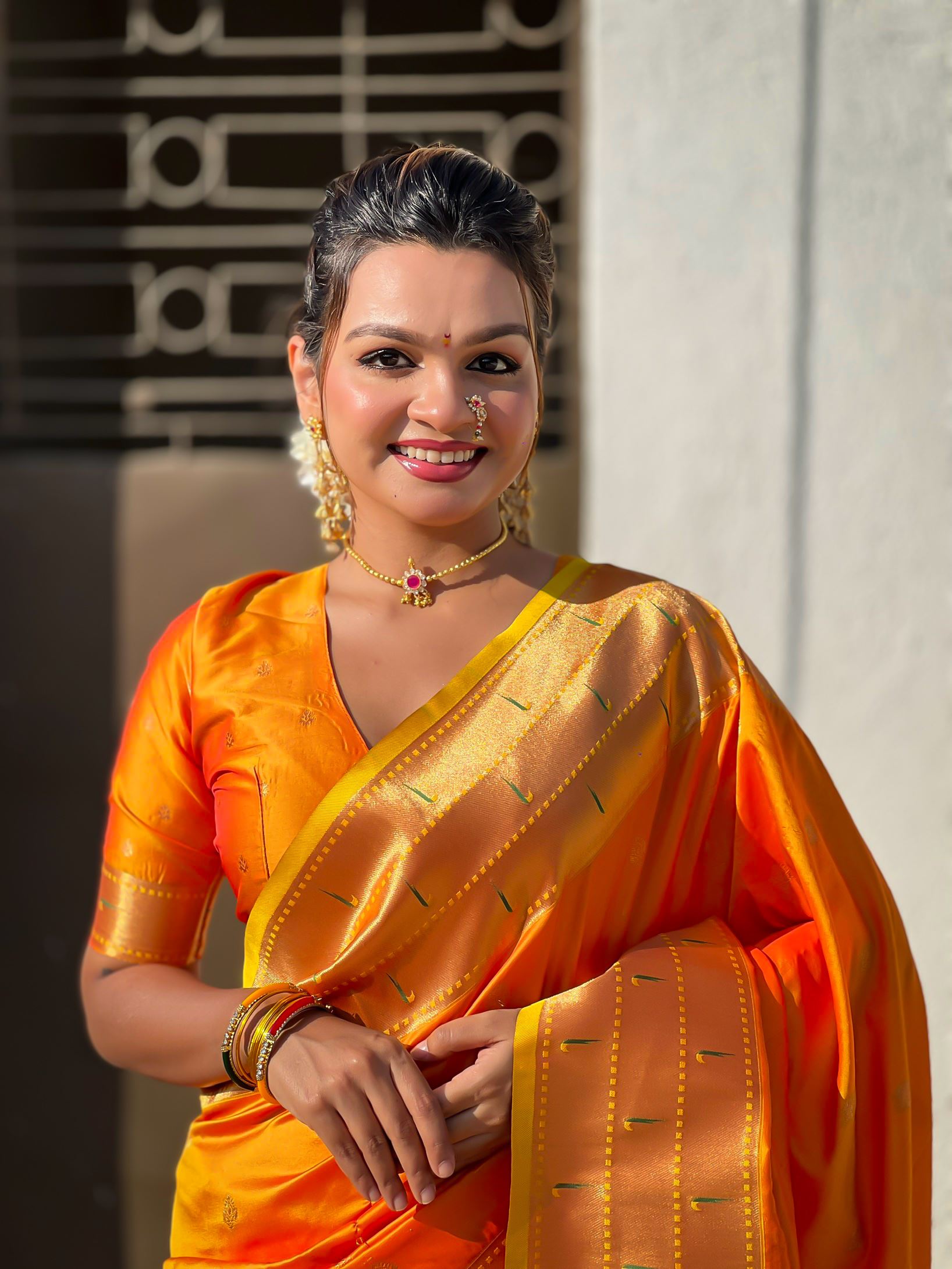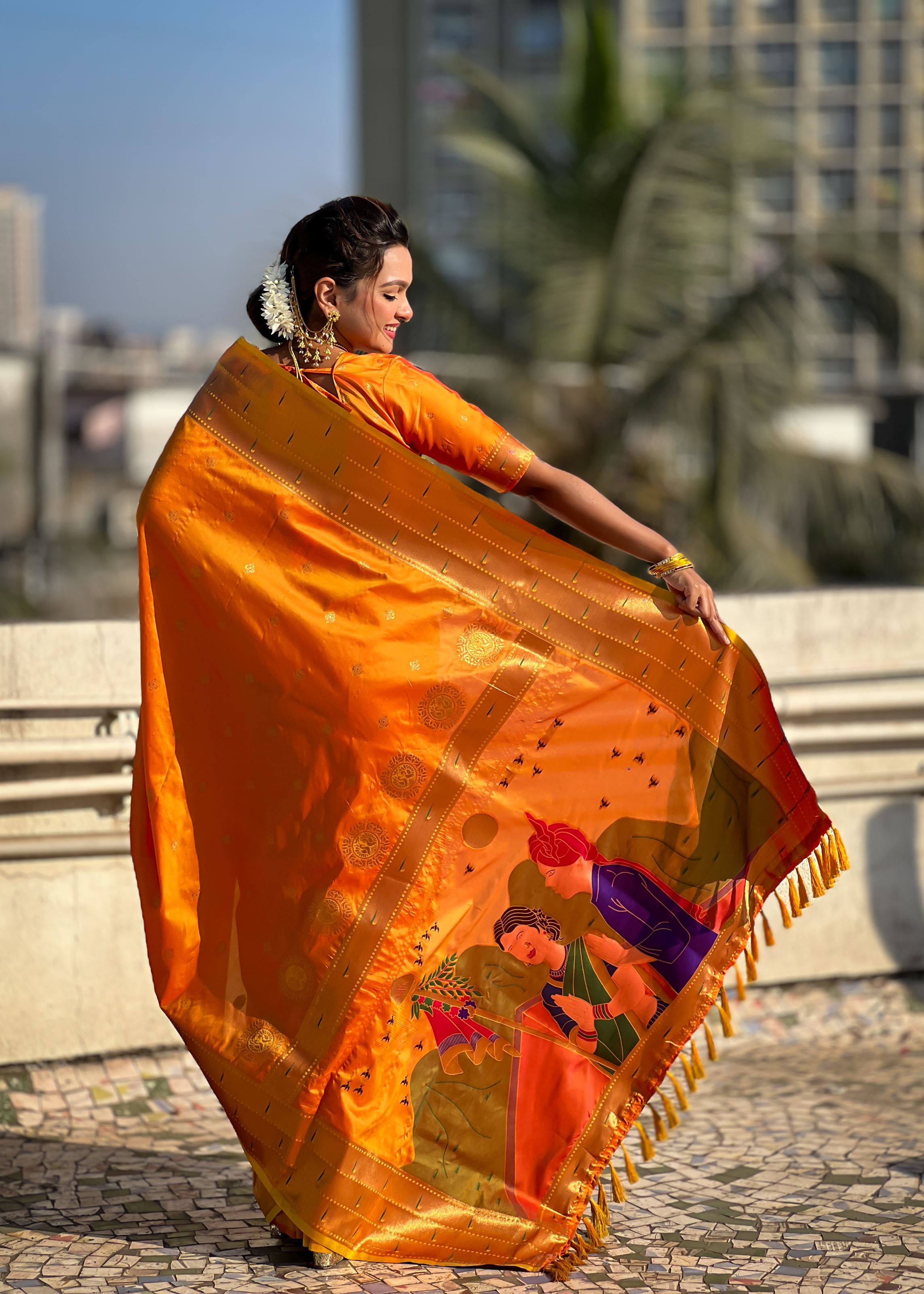 Orange Silk Blend Paithani Saree With Gudi Padwa Print