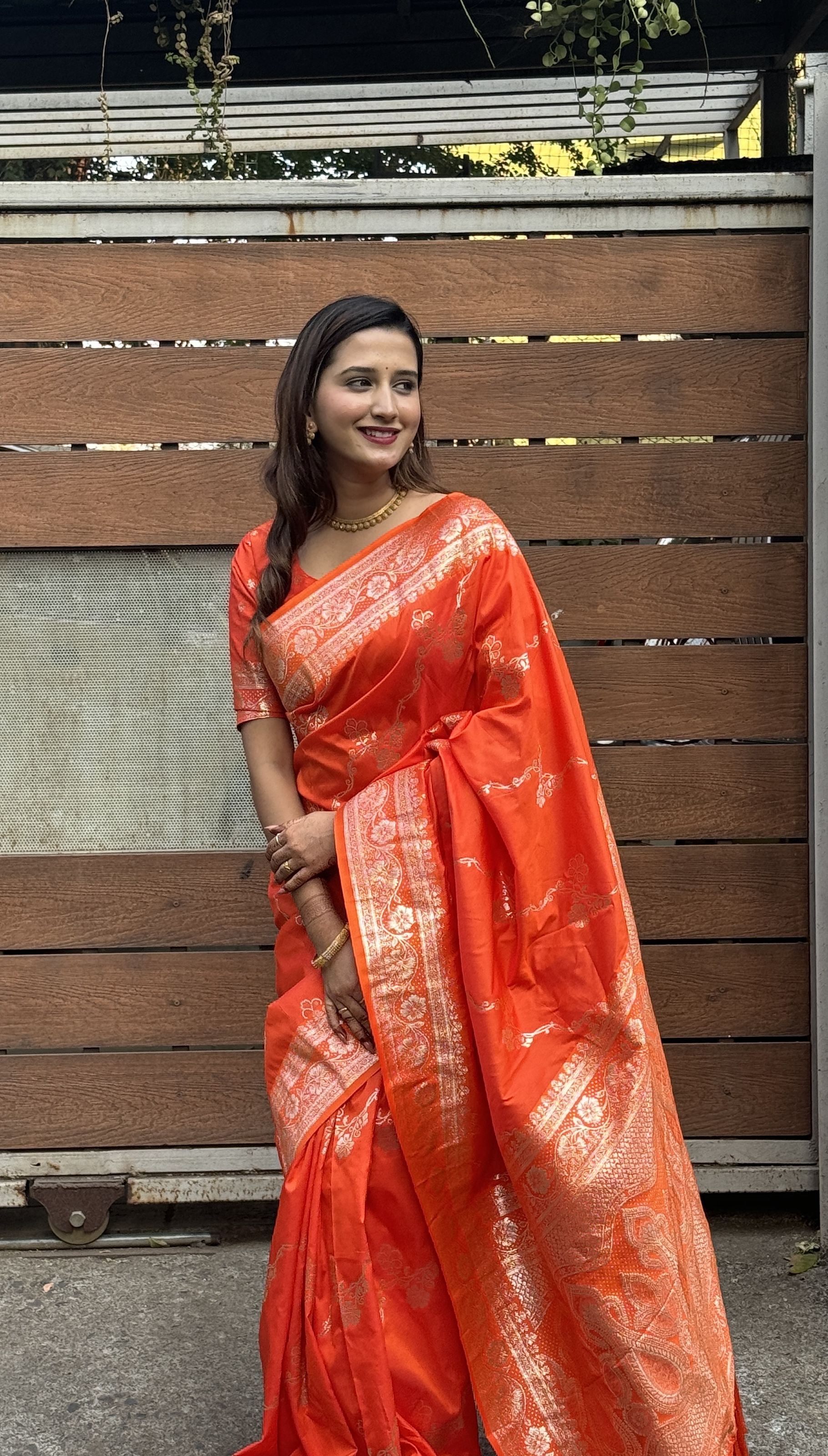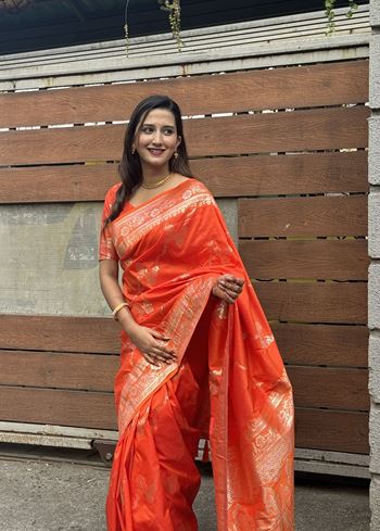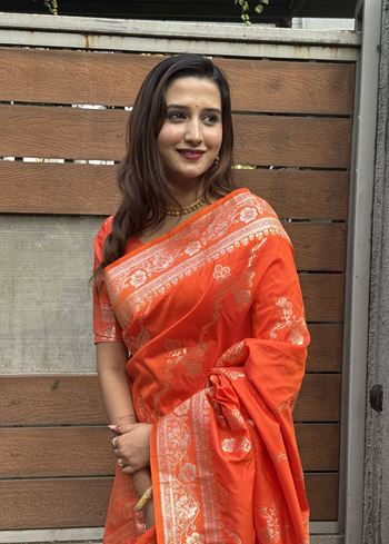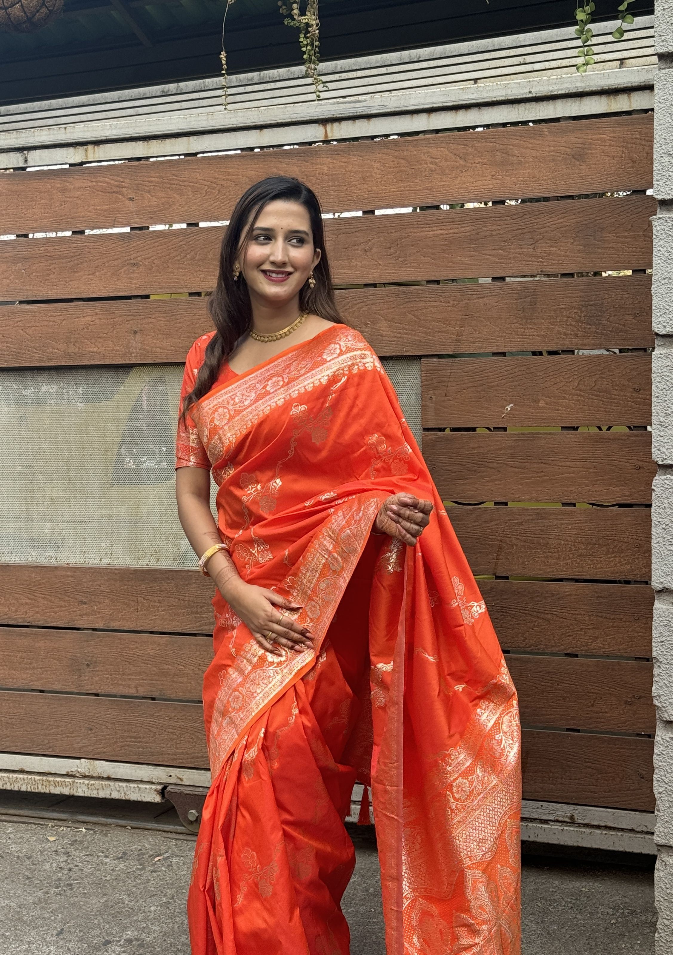 Paired with a matching orange silk blouse, this saree offers a polished and coordinated look. The soft yet rich Banarasi silk fabric allows graceful draping while ensuring all-day comfort. Accessorize with statement jewelry, stylish heels, and ethnic accessories to complete a festive-ready ensemble that radiates sophistication. Designed for women who appreciate authentic silk artistry, this saree merges tradition, opulence, and contemporary elegance seamlessly.