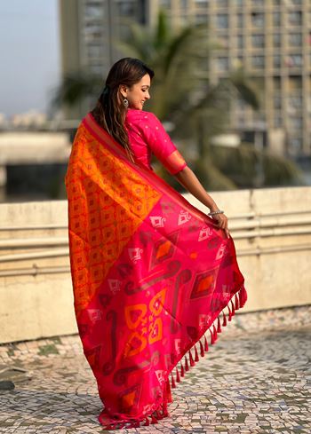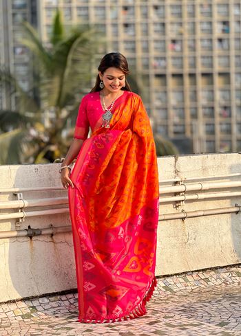 Infuse vibrancy into your ethnic wardrobe with the Orange Woven Meenakari Ikkat Designer Patola Silk Ceremonial Saree from Aethnofit Fashions. Crafted from premium Patola silk, this saree features intricate Ikkat weaving enriched with delicate Meenakari work, creating a striking and luxurious design. The lively orange body beautifully contrasts with the pink silk blouse, offering a sophisticated and festive ensemble perfect for weddings, celebrations, and special occasions.