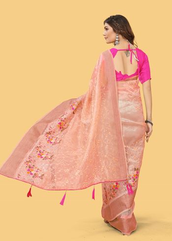 Add a vibrant touch to your festive collection with the Orange Woven Patta Organza Silk Saree With Embroidery And Stone Work from Aethnofit Fashions. Crafted from premium organza silk, this saree offers a lightweight and flowing drape, combining elegance with comfort for weddings, parties, and special occasions. The bright orange hue paired with a contrasting pink art silk blouse creates a lively and sophisticated ensemble, perfect for women seeking designer ethnic wear.