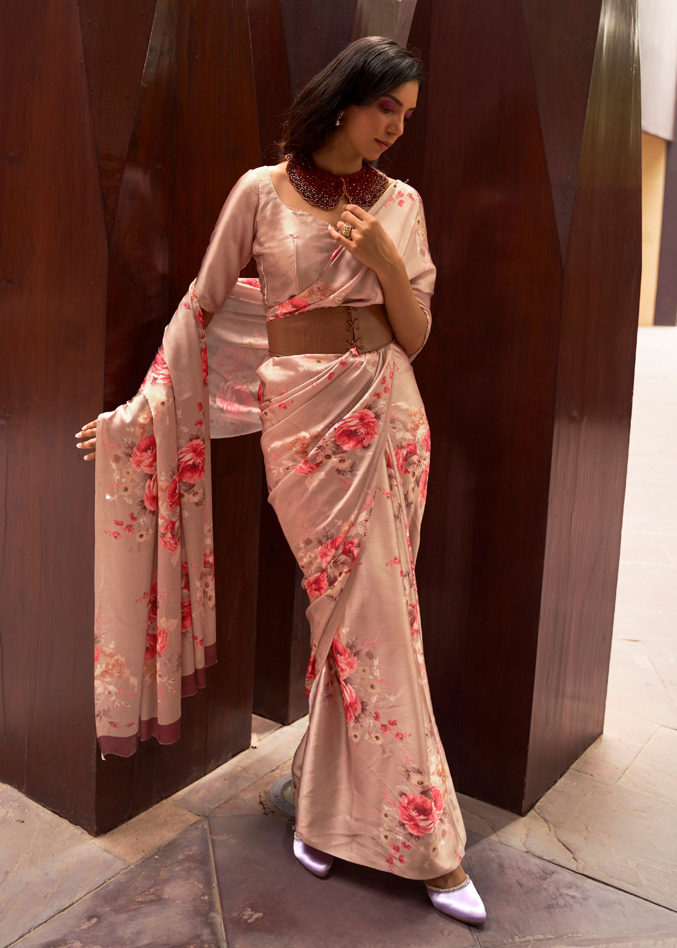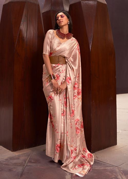 Pale Copper Satin Crepe Saree With Digital Printed Work