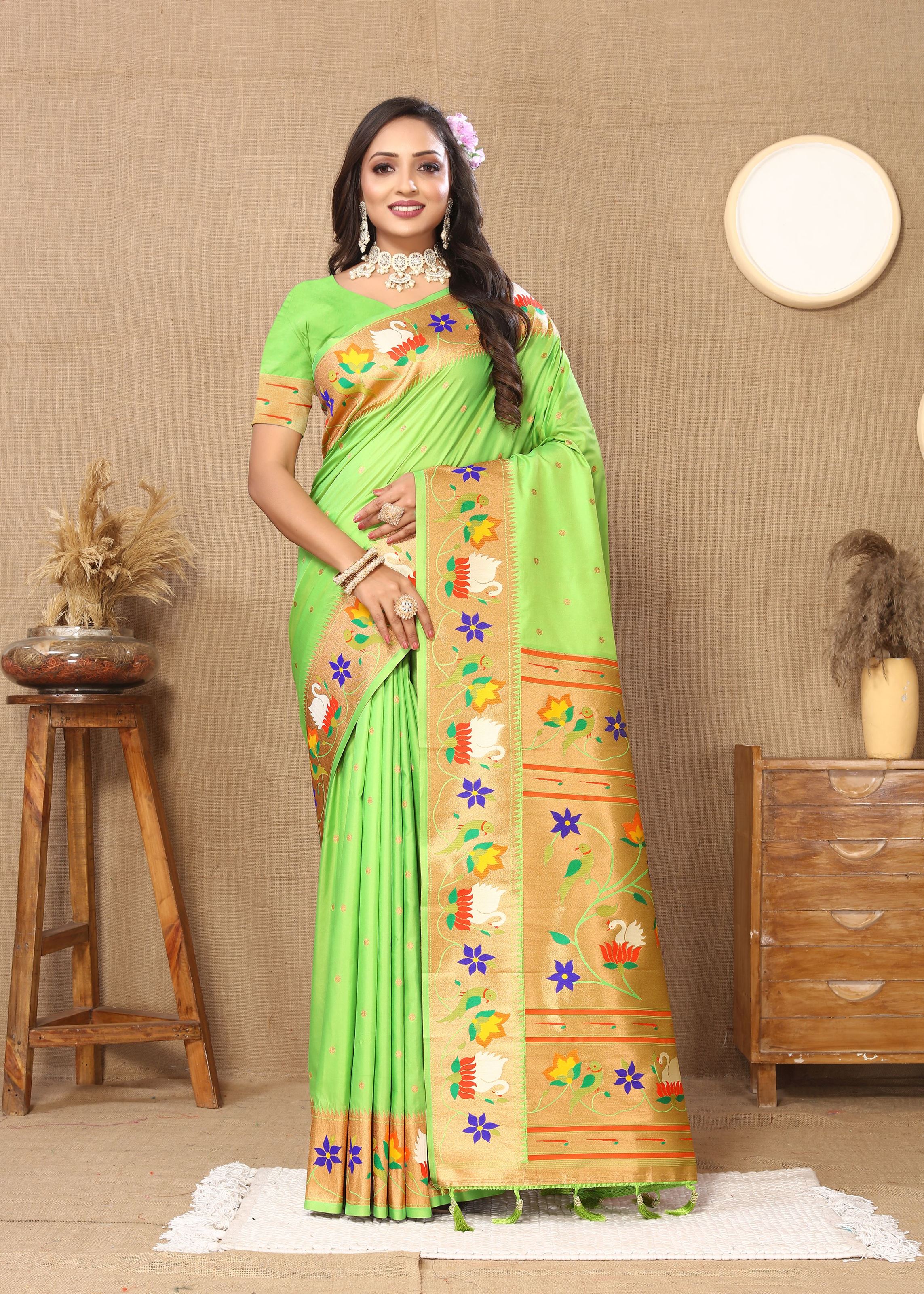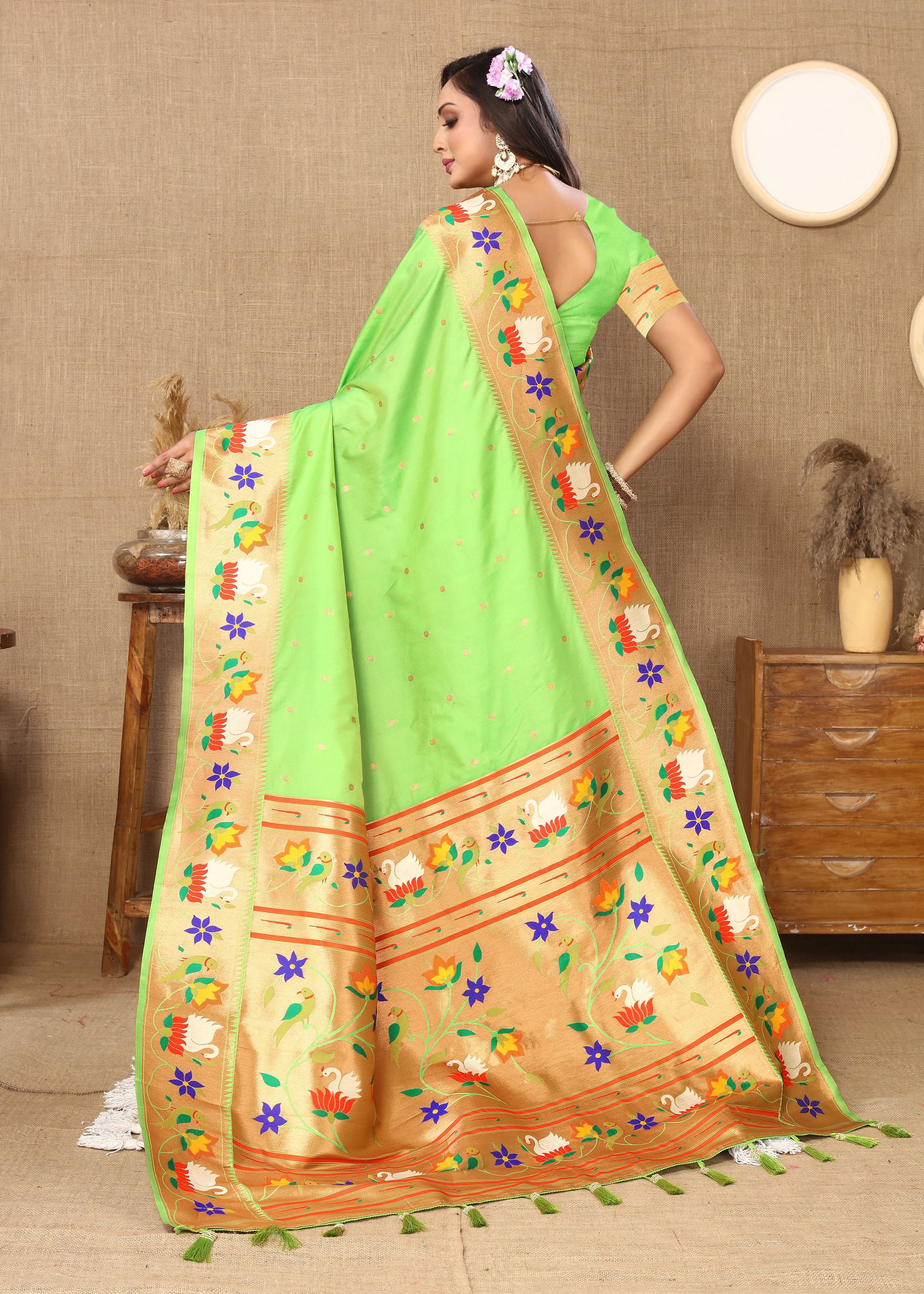 Parrot Green Paithani Silk Woven Meenakari Paithani Designer Ethnic Heavy Looks Saree