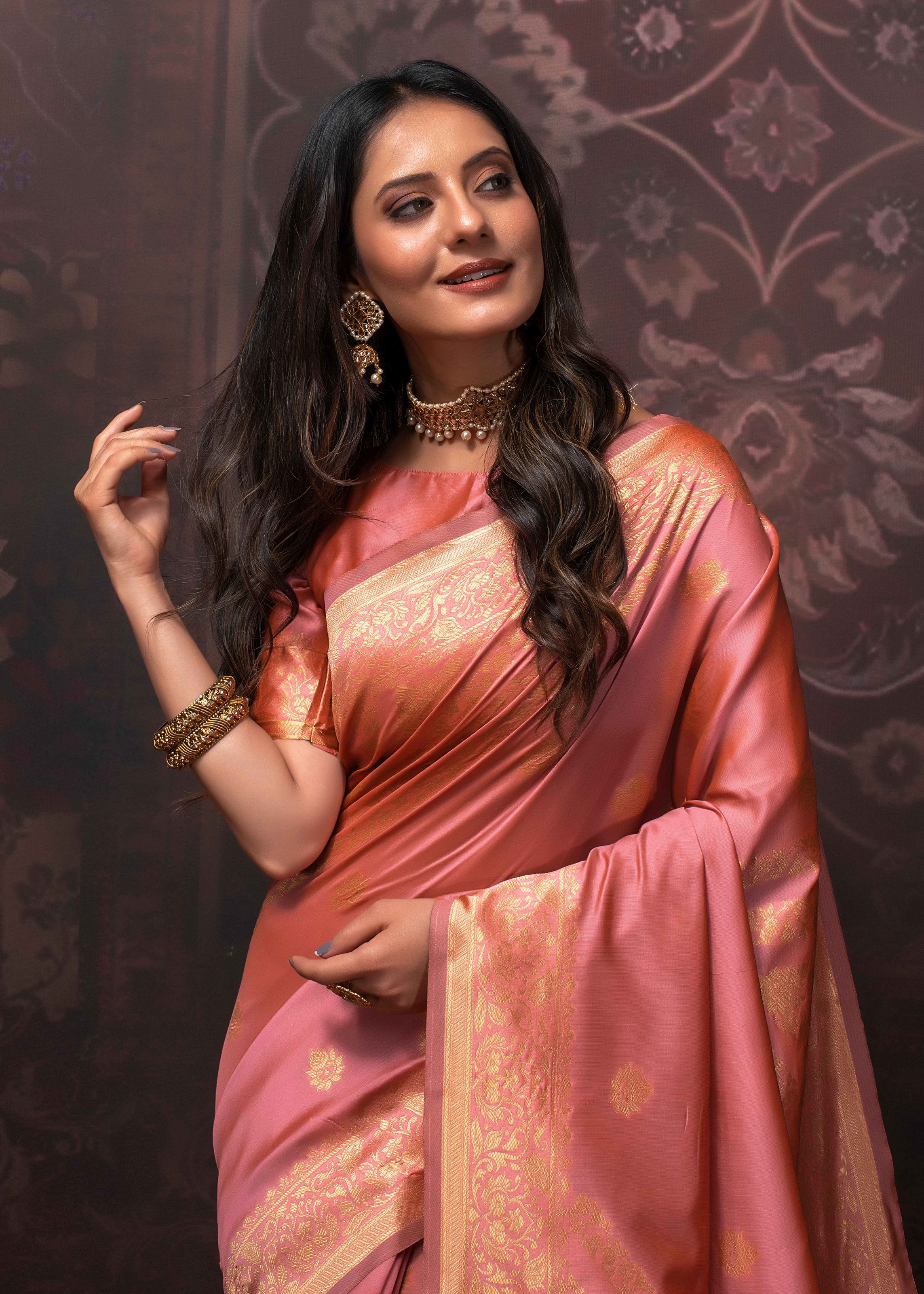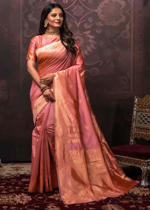 Peach Banarasi Silk Blend Saree with Jacquard Woven Work