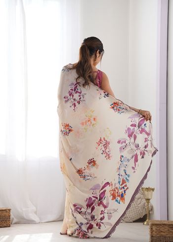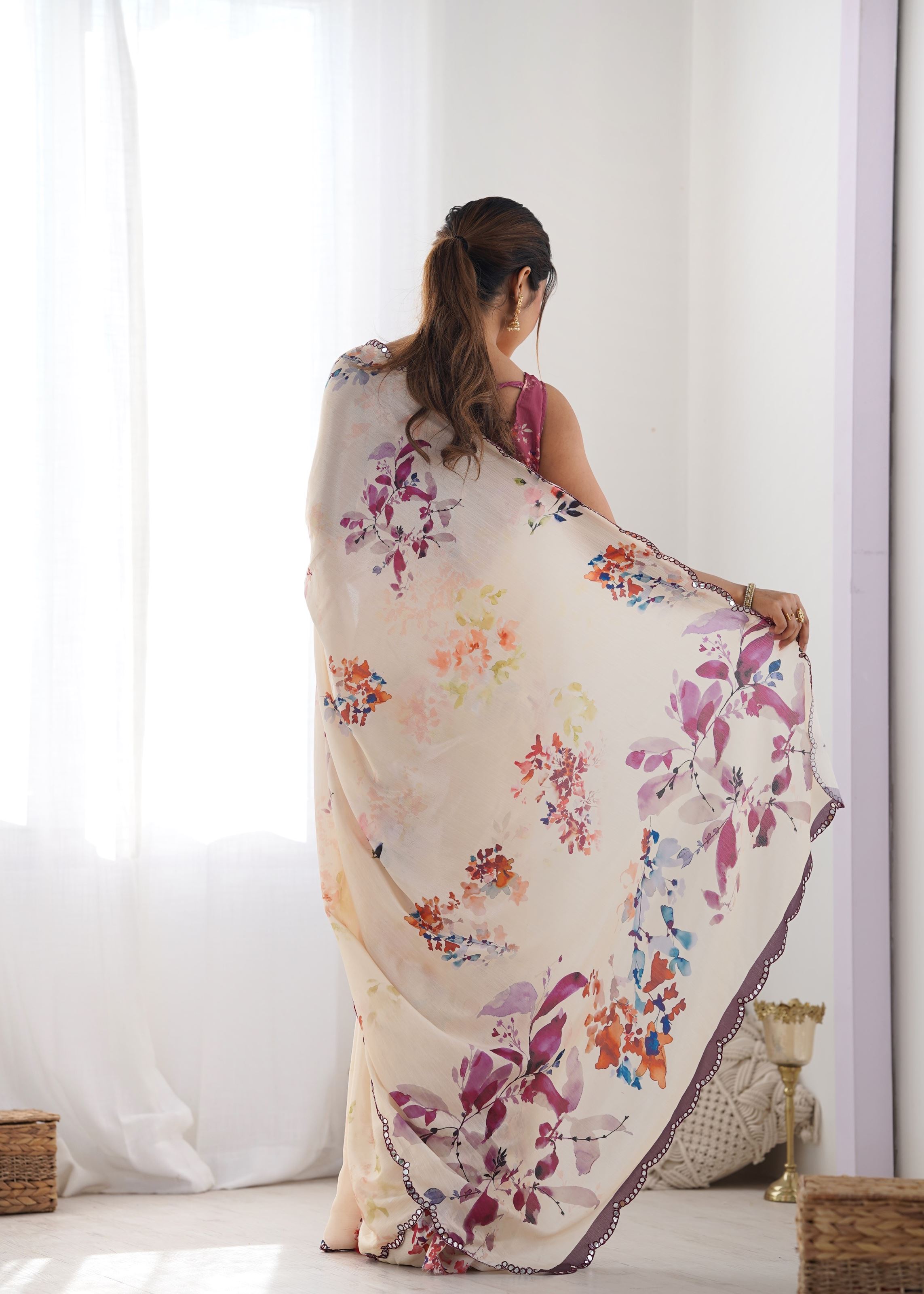 Peach Beautiful Chinon Fabric Digital Printed Saree With Mirror Cut Work