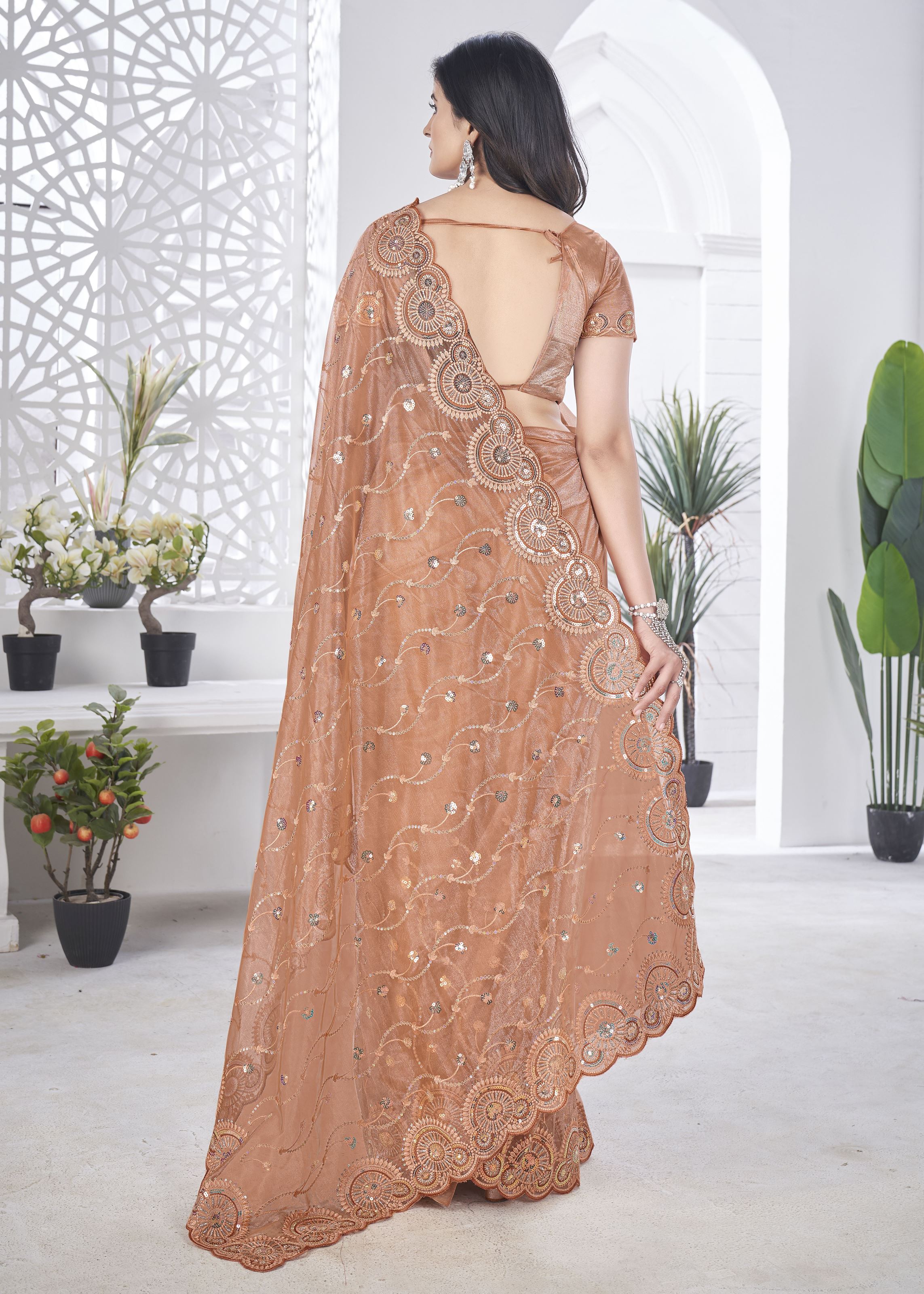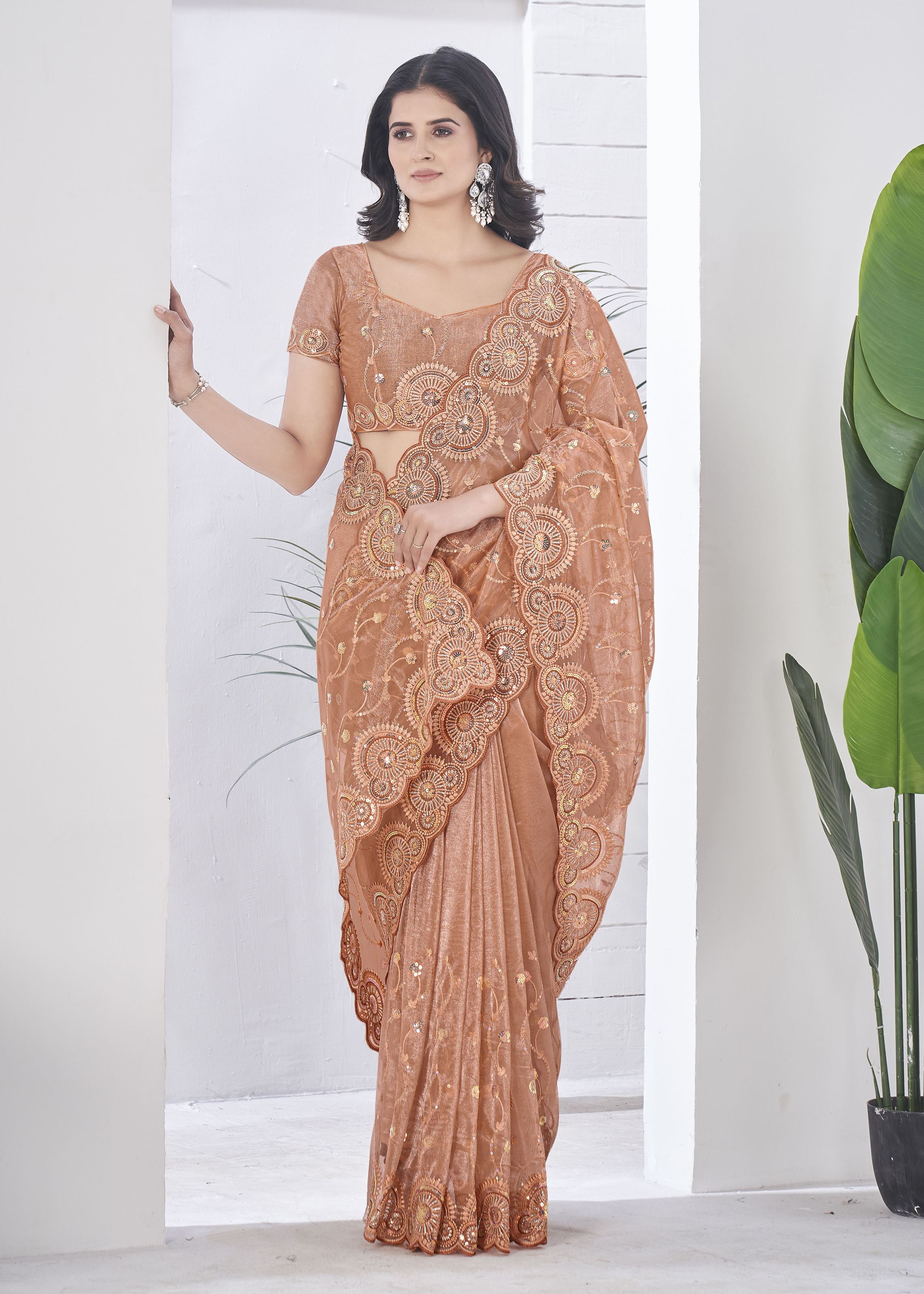 Bring a soft touch of elegance to your wardrobe with this Peach Beautiful Tissue Net Sequins Work Saree from Aethnofit Fashions. Crafted in lightweight tissue net fabric, this saree in a delicate peach shade exudes grace and sophistication. Adorned with exquisite sequins embroidery, it sparkles beautifully under any light. The matching tissue blouse in peach enhances the ensemble with its coordinated design, making this saree ideal for weddings, receptions, festive occasions, and Bollywood-inspired parties. Designed for comfort and elegance, it is a perfect choice for women who prefer effortless glamour.