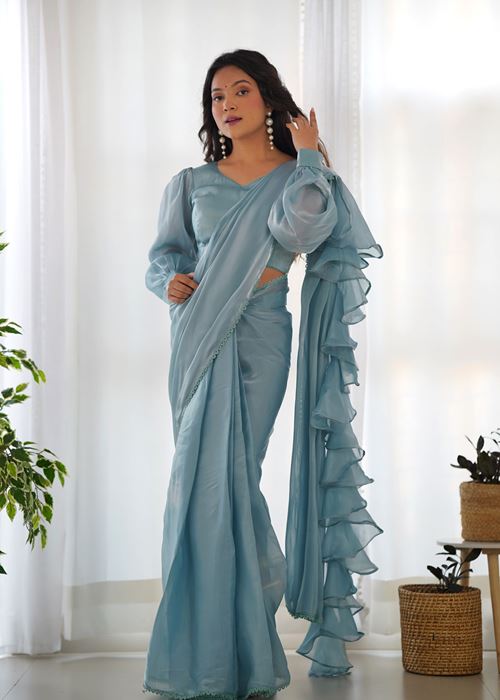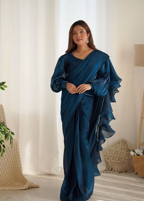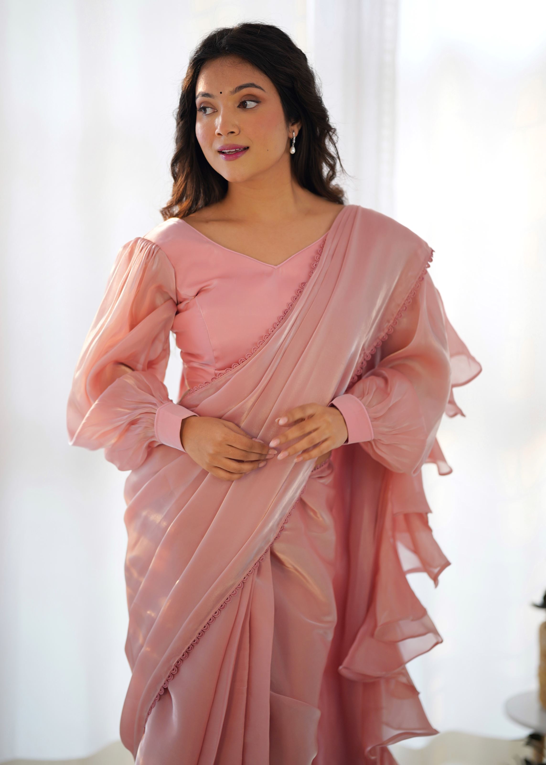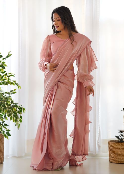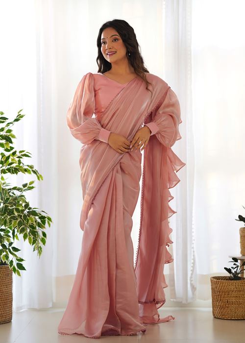 Peach Colour Zimichhu Silk Fully Stitched Ready To Wear Saree