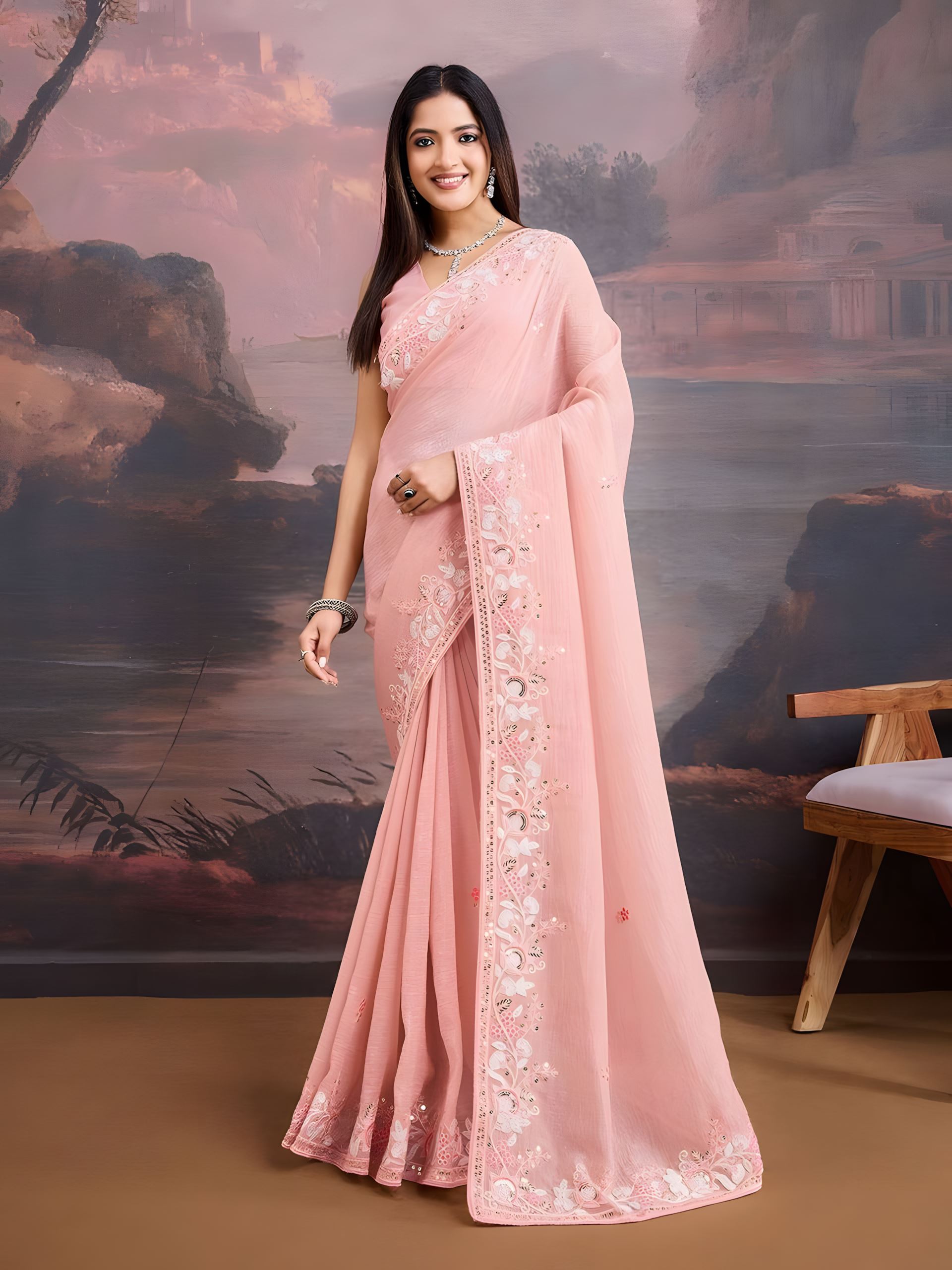 This saree is designed for the woman who seeks effortless grace with a touch of tradition. Accessorize with pearls or kundan pieces to enhance its soft charm.