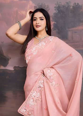 Peach Crunchy Soft Organza Saree with C-Pallu Embroidery Work Border