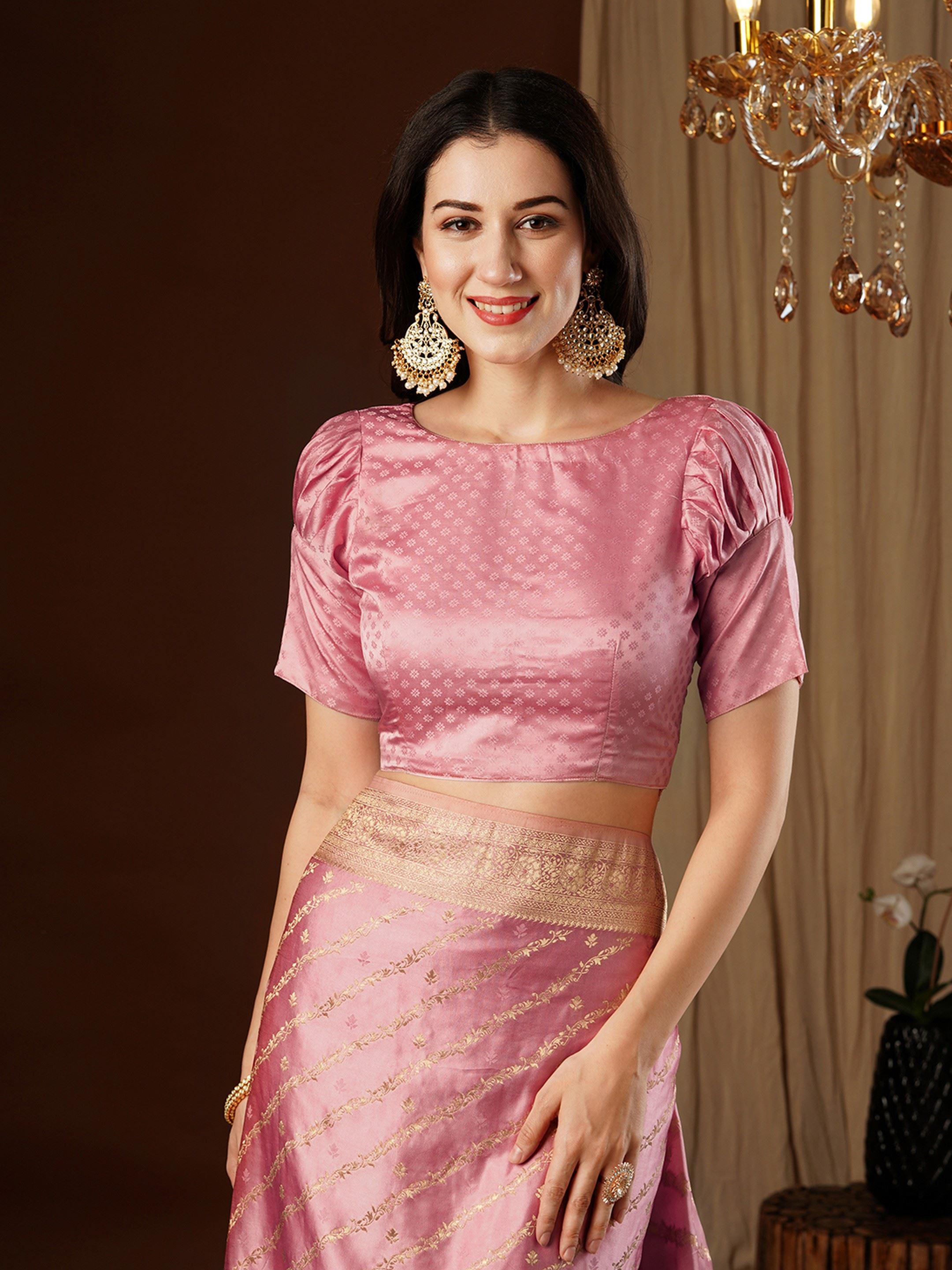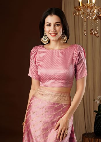 The saree is adorned with intricate jacquard woven patterns, highlighting exquisite craftsmanship and elevating its designer appeal. The delicate motifs and refined texture bring a touch of luxury, ensuring you make a lasting impression wherever you go. Paired with a matching peach satin silk blouse, this ensemble creates a seamless and regal look.