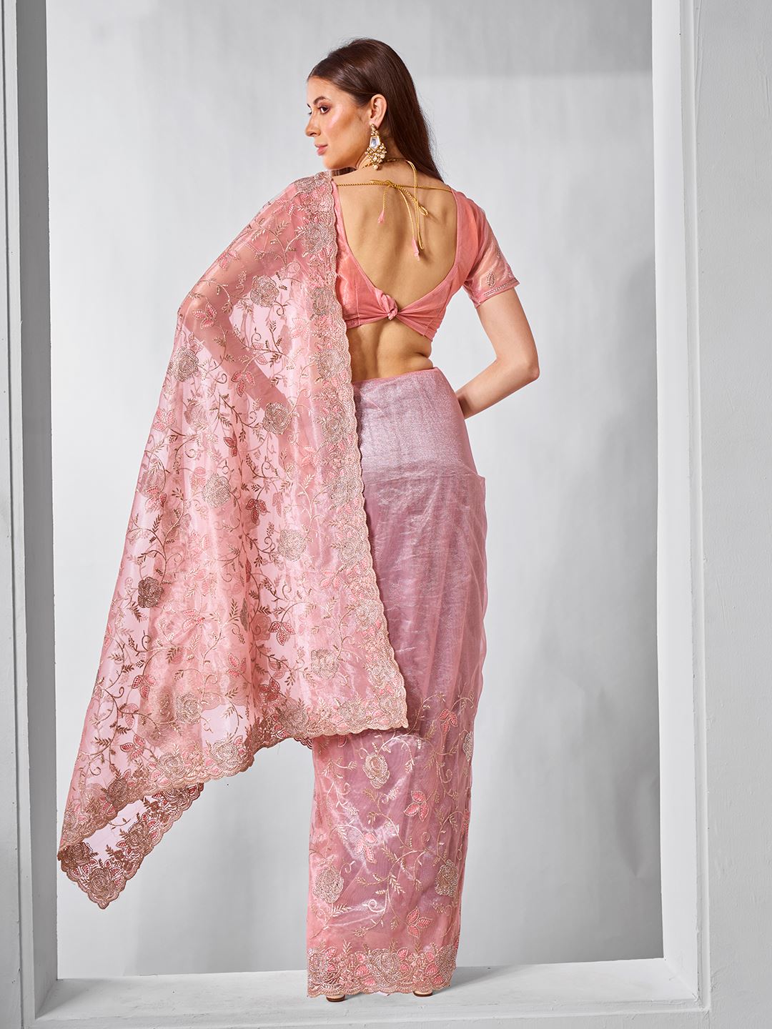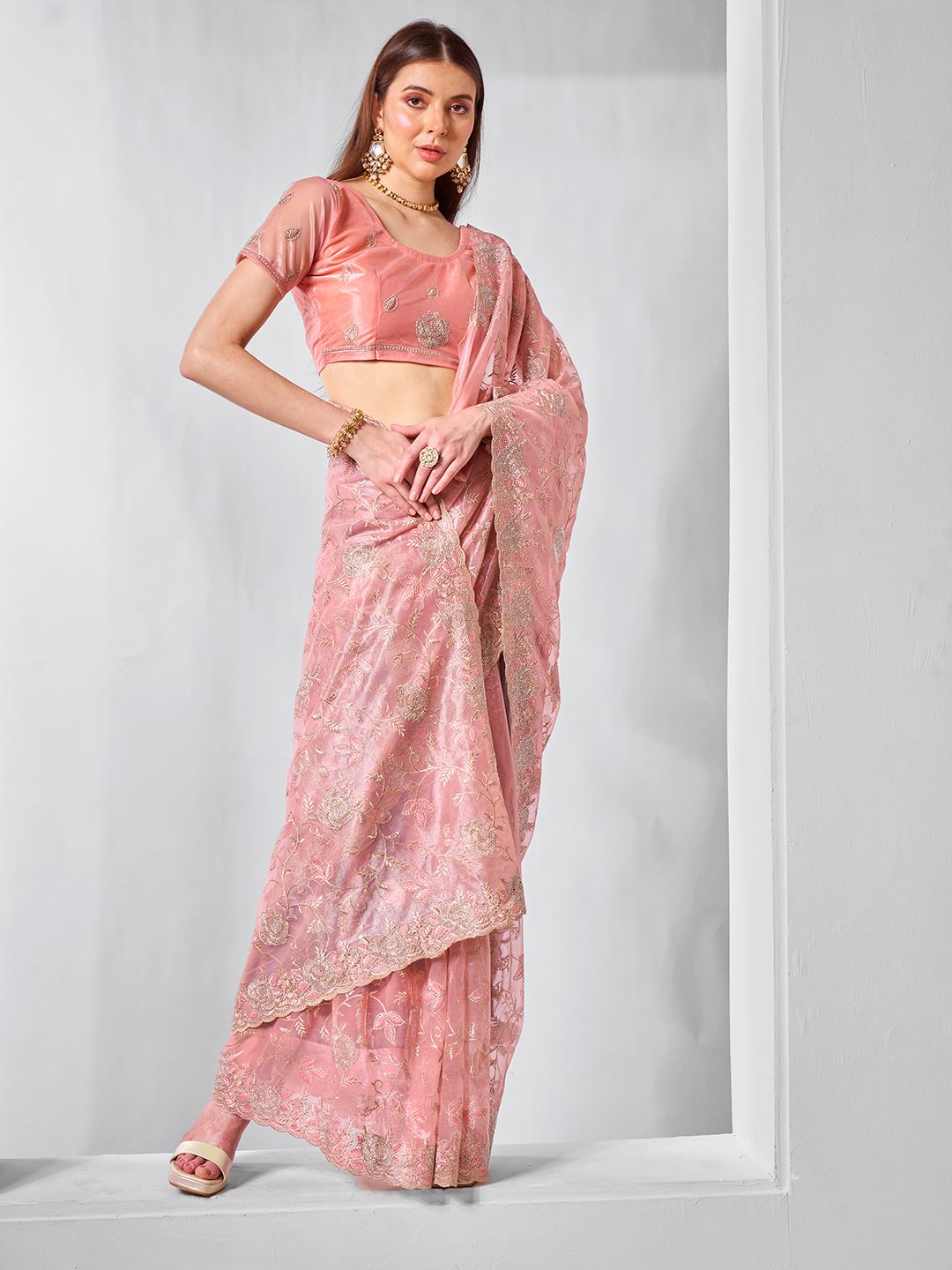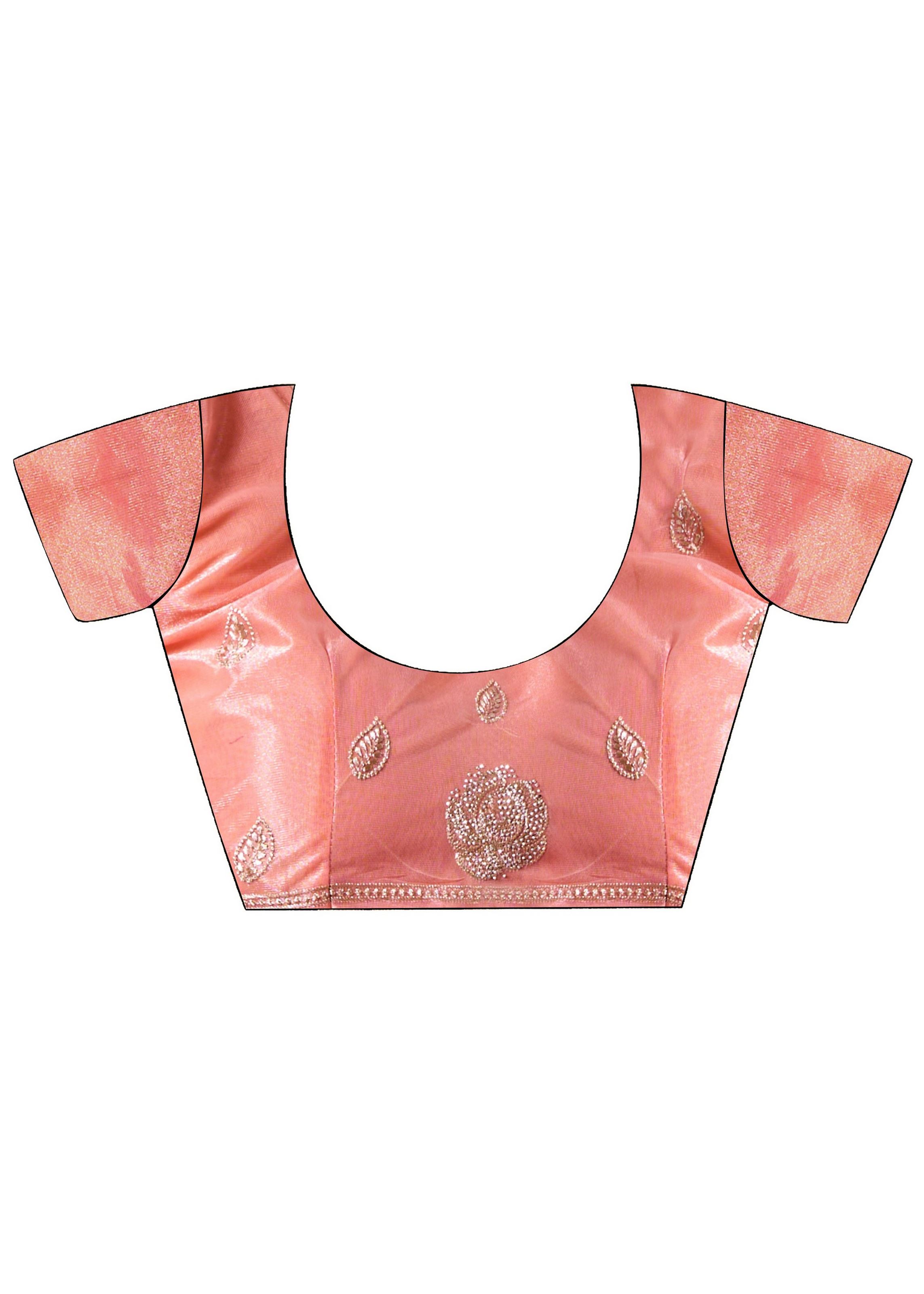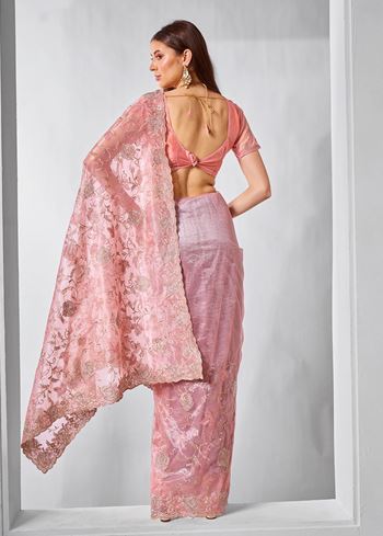 Peach Gold Tissue Net Fabric Designer Embroidery Work Ceremonial Partywear Saree