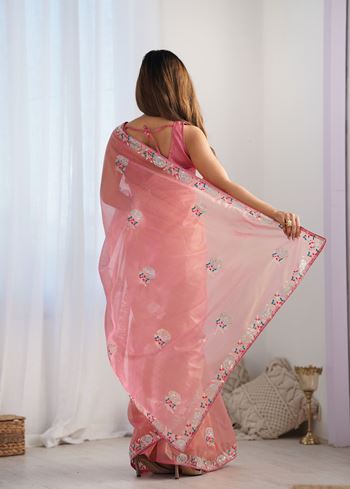 Peach Gold Twill Net Fancy Partywear Embroidered Saree