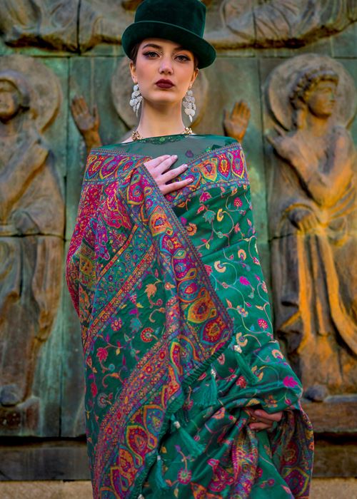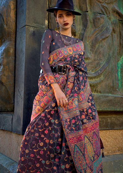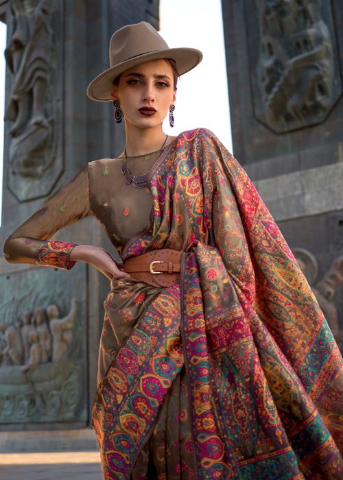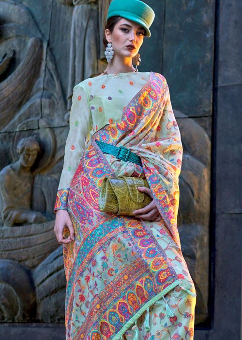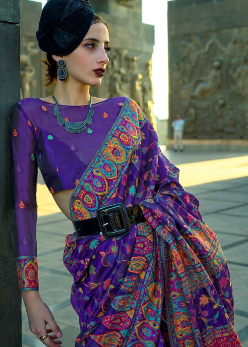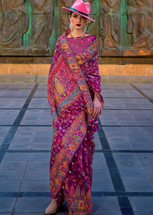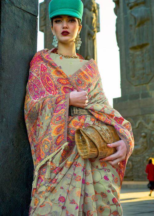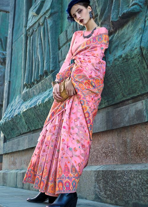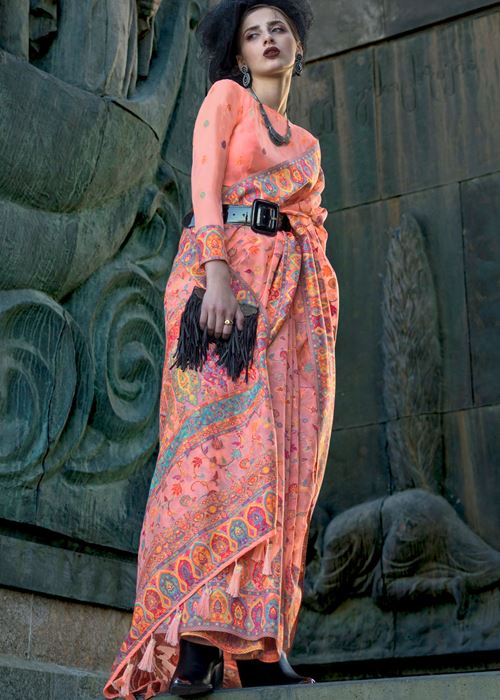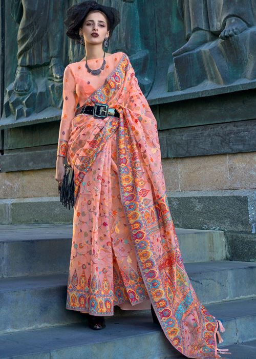 Peach Handloom Organza Saree With Handloom Kashmiri Jacquard Woven Work