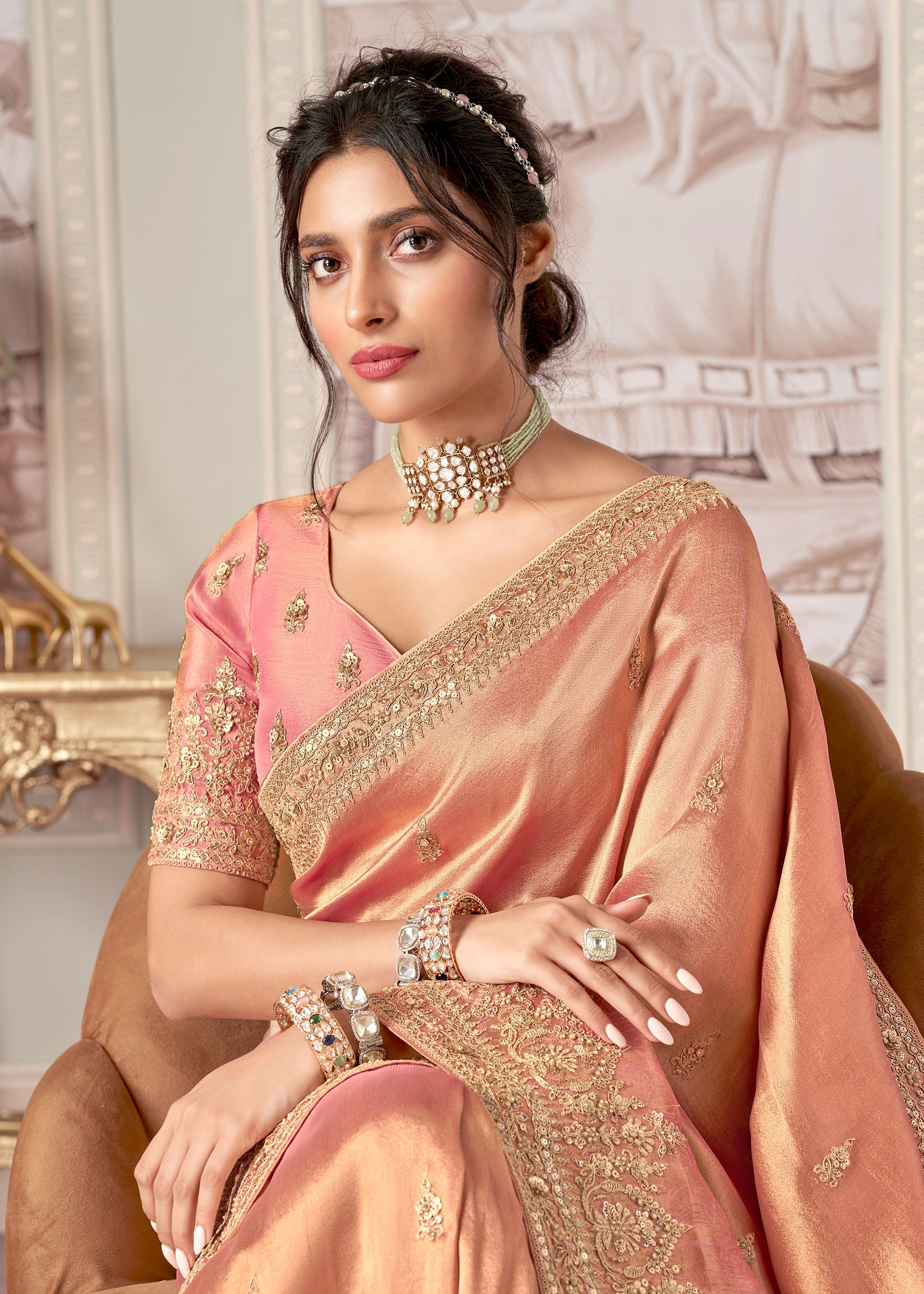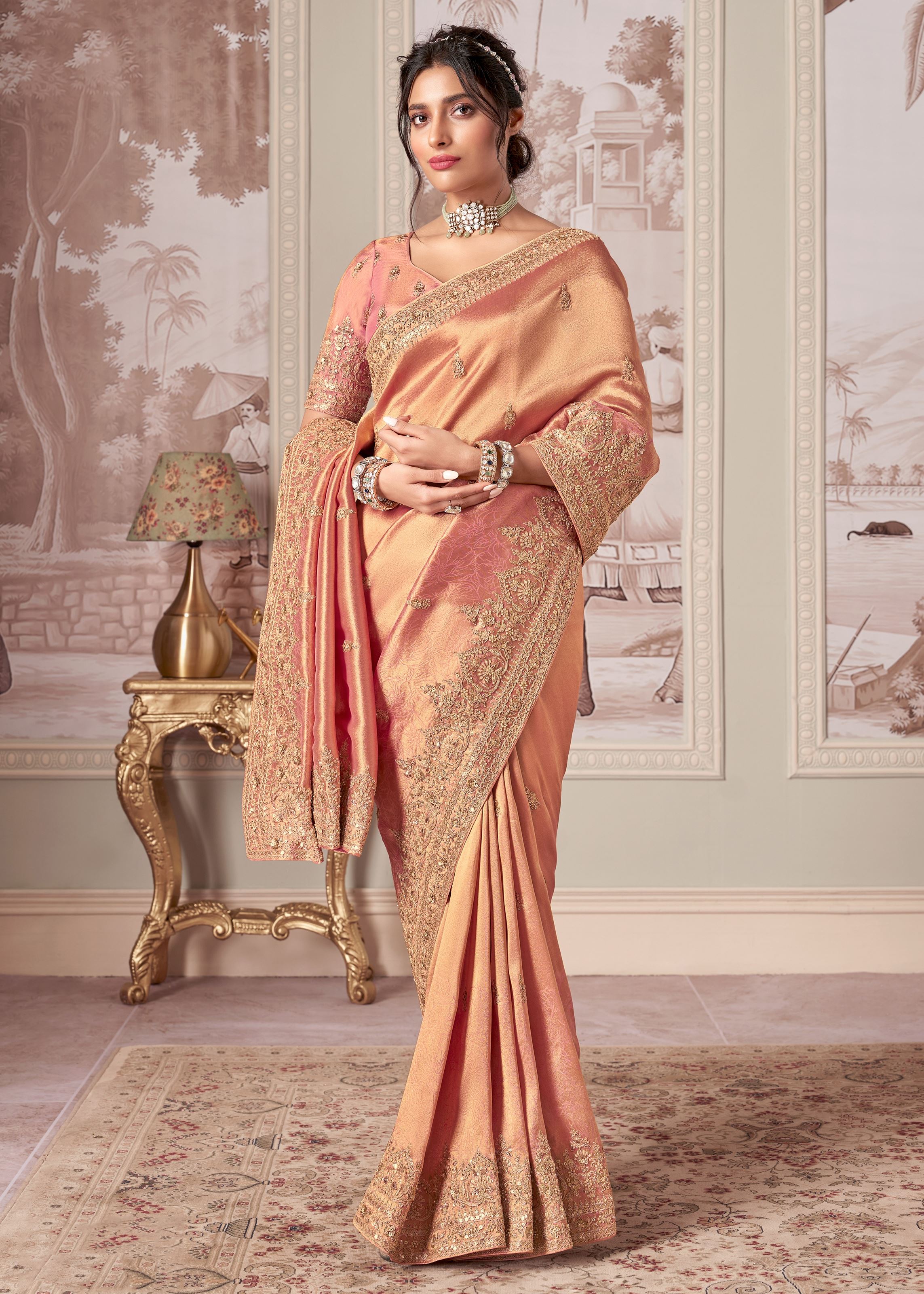 Ideal for those searching for embroidered jacquard silk sarees, pastel peach silk sarees, or zari and sequins wedding sarees, this drape is designed to turn heads.