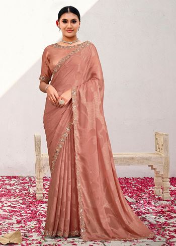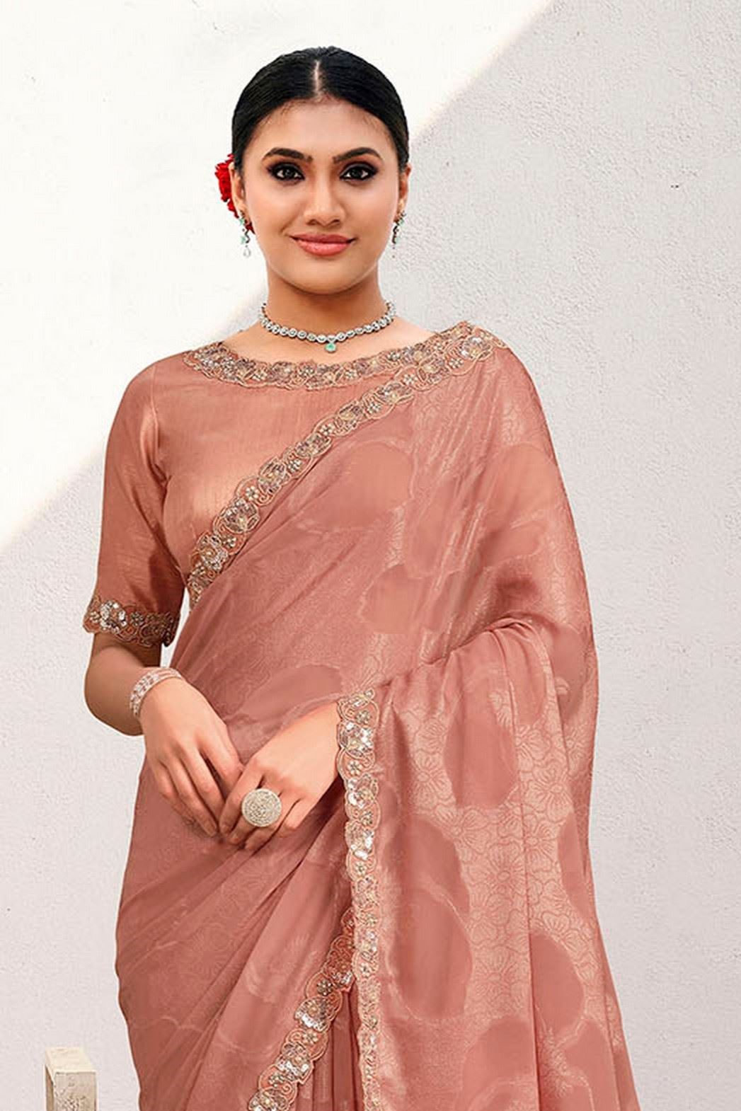 Peach Jaquard Georgette Heavy Embroidery Work Wedding Wear Saree