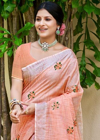 The soothing peach hue adds a refreshing and graceful touch, making it ideal for daytime celebrations, festive brunches, or office ethnic days. Its airy, breathable texture ensures lasting comfort even in warm weather, while the natural sheen of linen enhances the saree’s subtle sophistication.