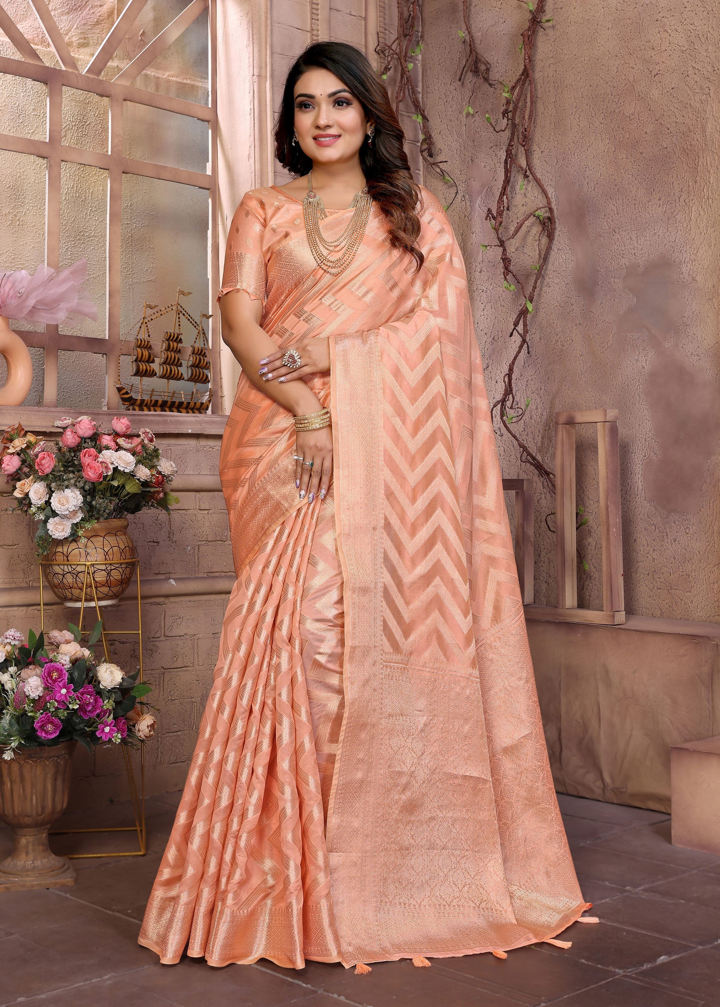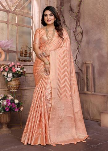 Peach Organza Woven Jari Designer Heavy Ceremonial Saree