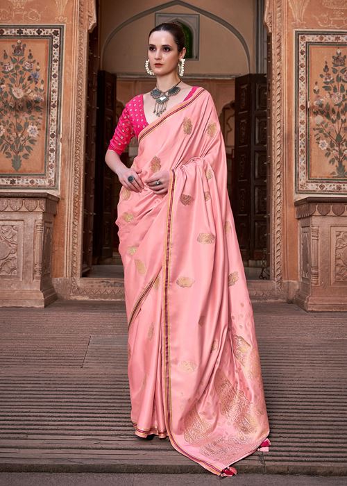 Peach Pure Satin Silk Saree With Woven Zari Work