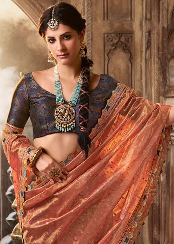 Explore our exclusive collection of designer sarees online, featuring pure tissue, Banarasi silk, pure silk, modal cotton, georgette, chiffon, and more. This Peach Pure Tissue Saree is a versatile addition to your ethnic wardrobe and is available with worldwide shipping, including USA.