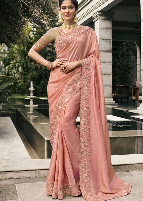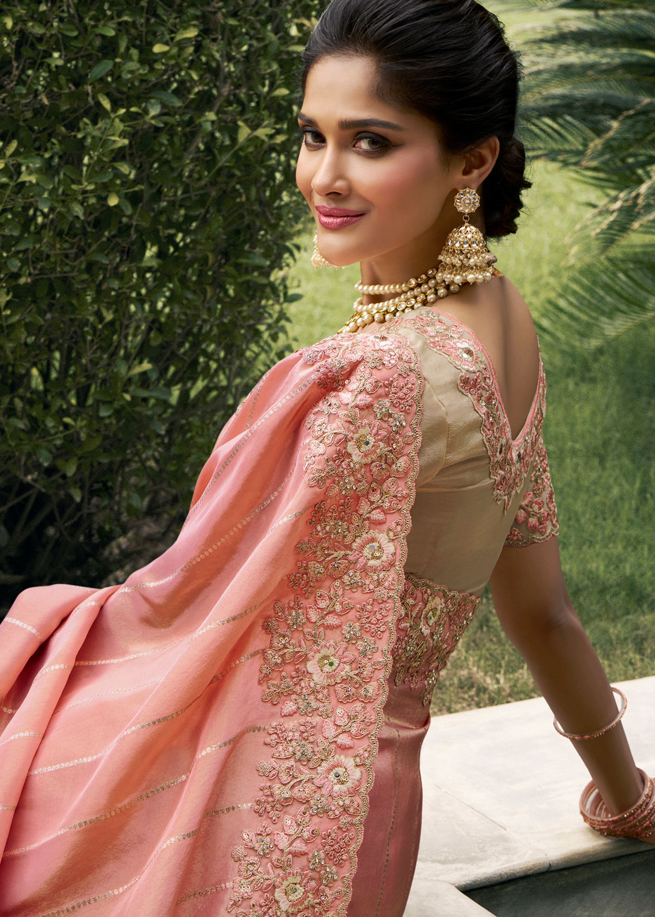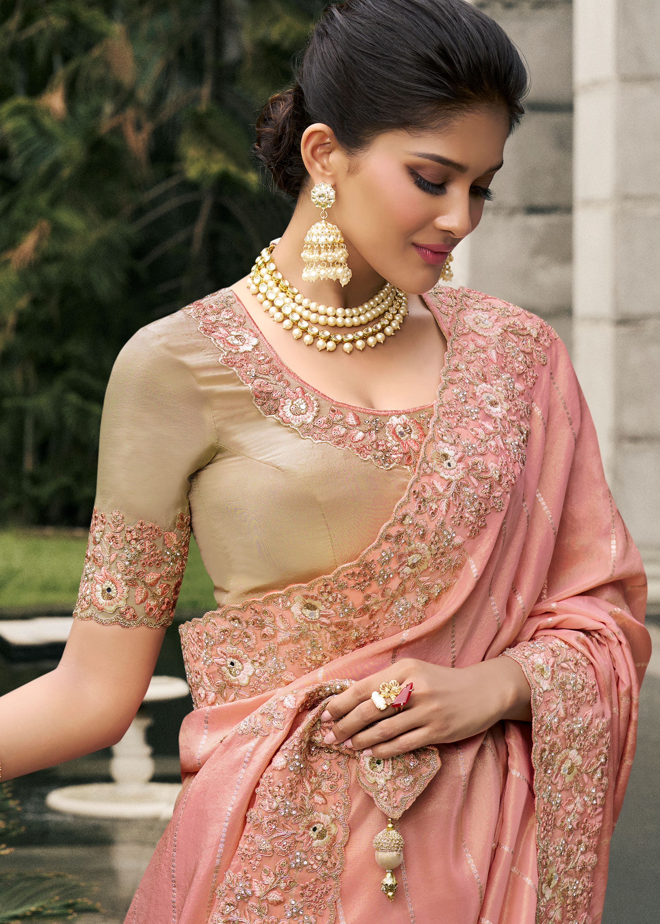 Peach Saree With Heavy Thread Embroidery, Stone, Pearl, Real Mirror Work