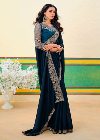 Peacock Blue Beautiful Embroidered Heavy Partywear Saree