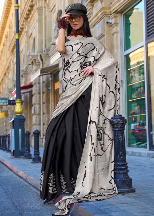 Pearl White & Black Satin Crepe Saree With Digital Print