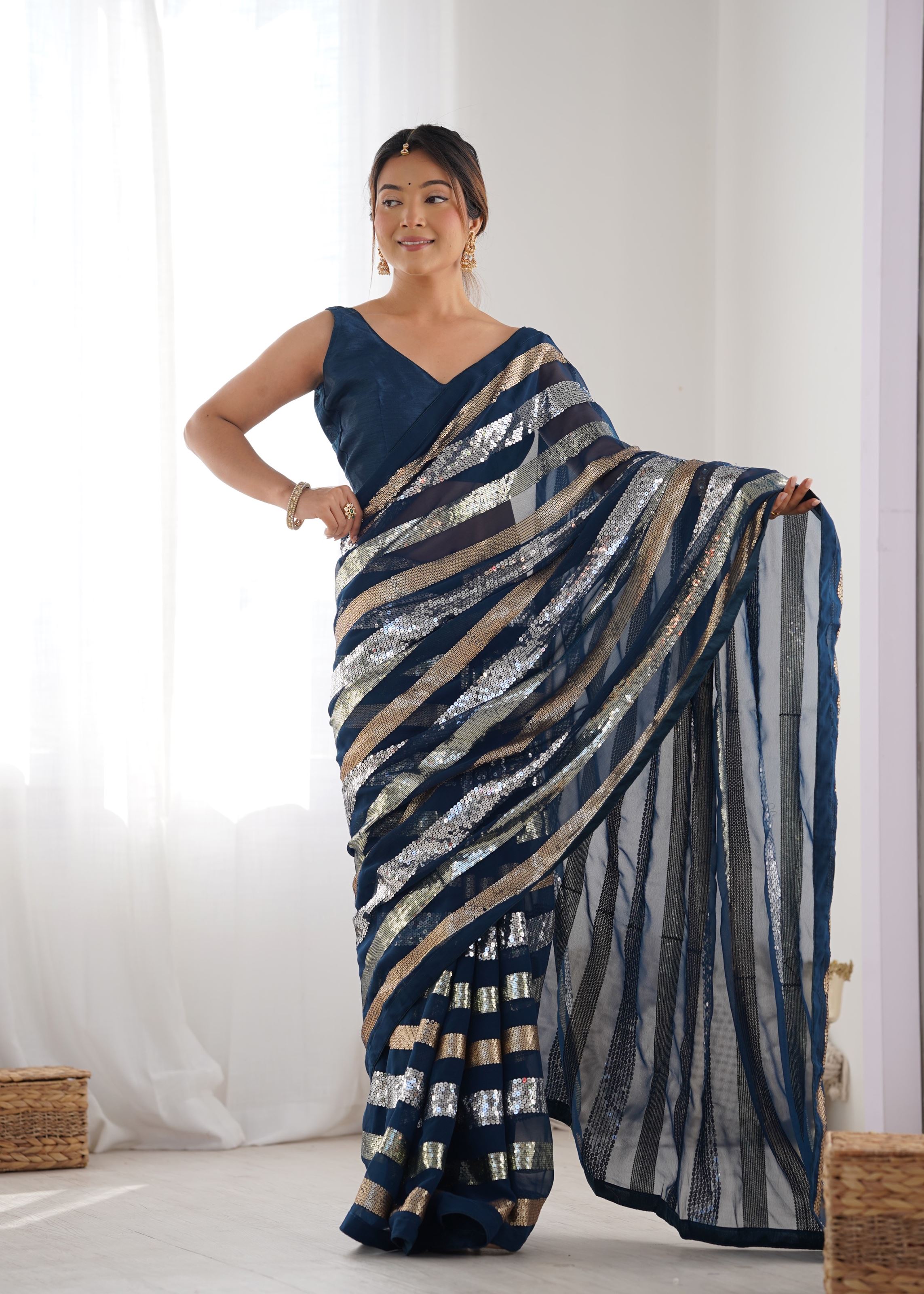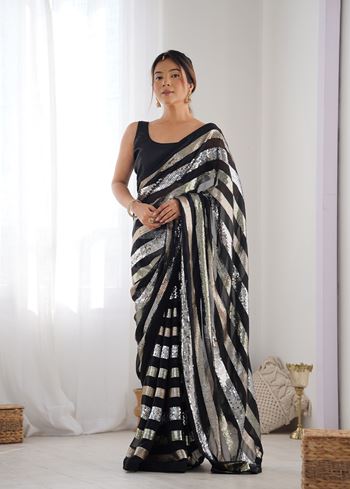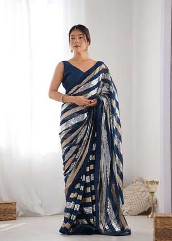 Aethnofit Fashions offers a curated collection of designer sarees online, including georgette, chiffon, and other luxurious fabrics. Explore our Bollywood Saree Blouse collection for partywear or browse our bridal and ethnic wear selections for special occasions. Enjoy affordable luxury, fast delivery, and exclusive deals while embracing the latest 2025 ethnic fashion trends.This petrol georgette sequins work saree is the perfect combination of glamour, tradition, and contemporary style. Available for worldwide shipping, including USA and India, you can shop confidently from our online boutique and elevate your ethnic wardrobe with premium designer sarees.